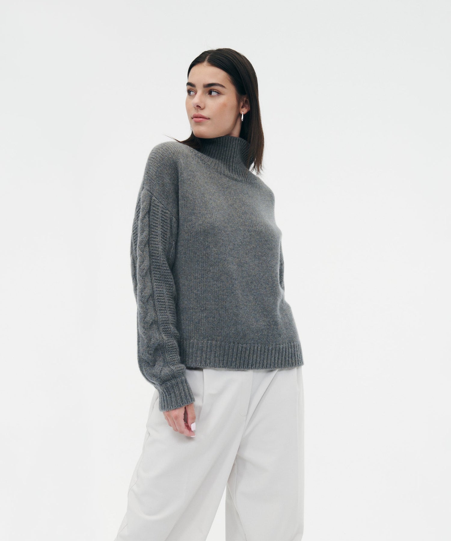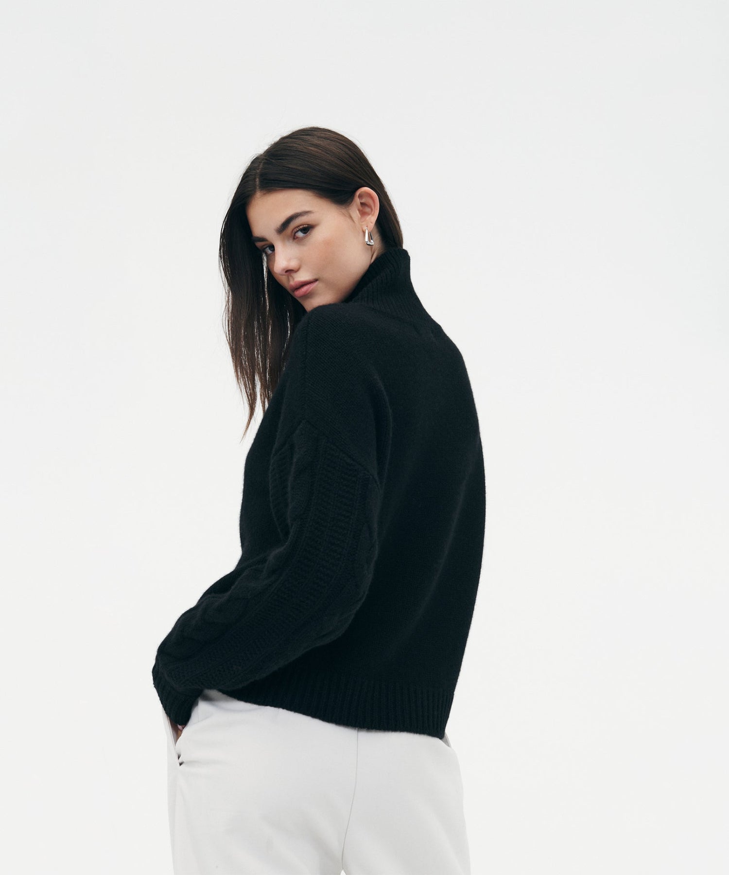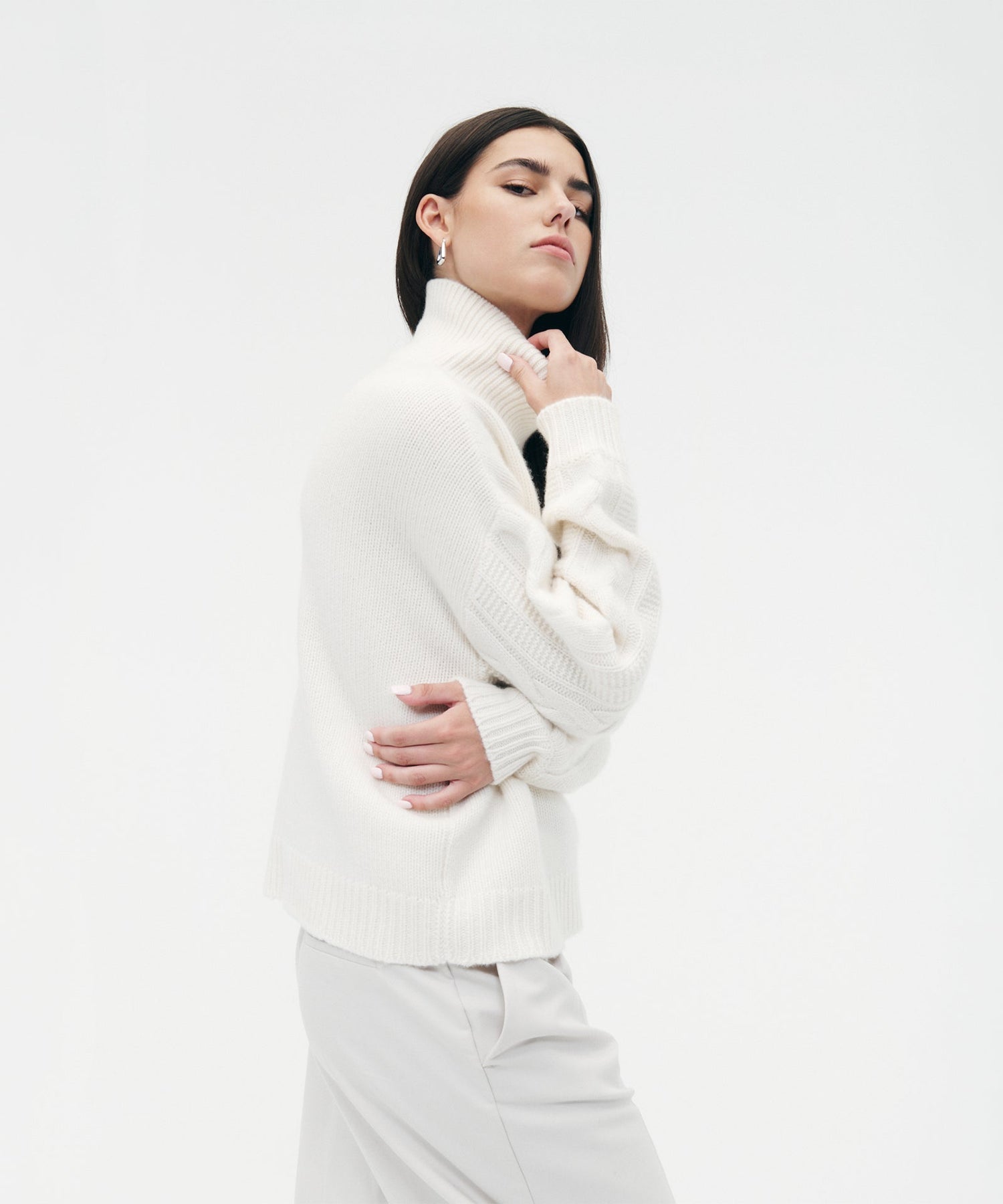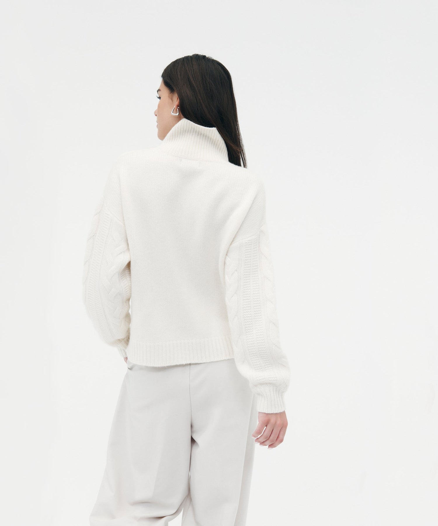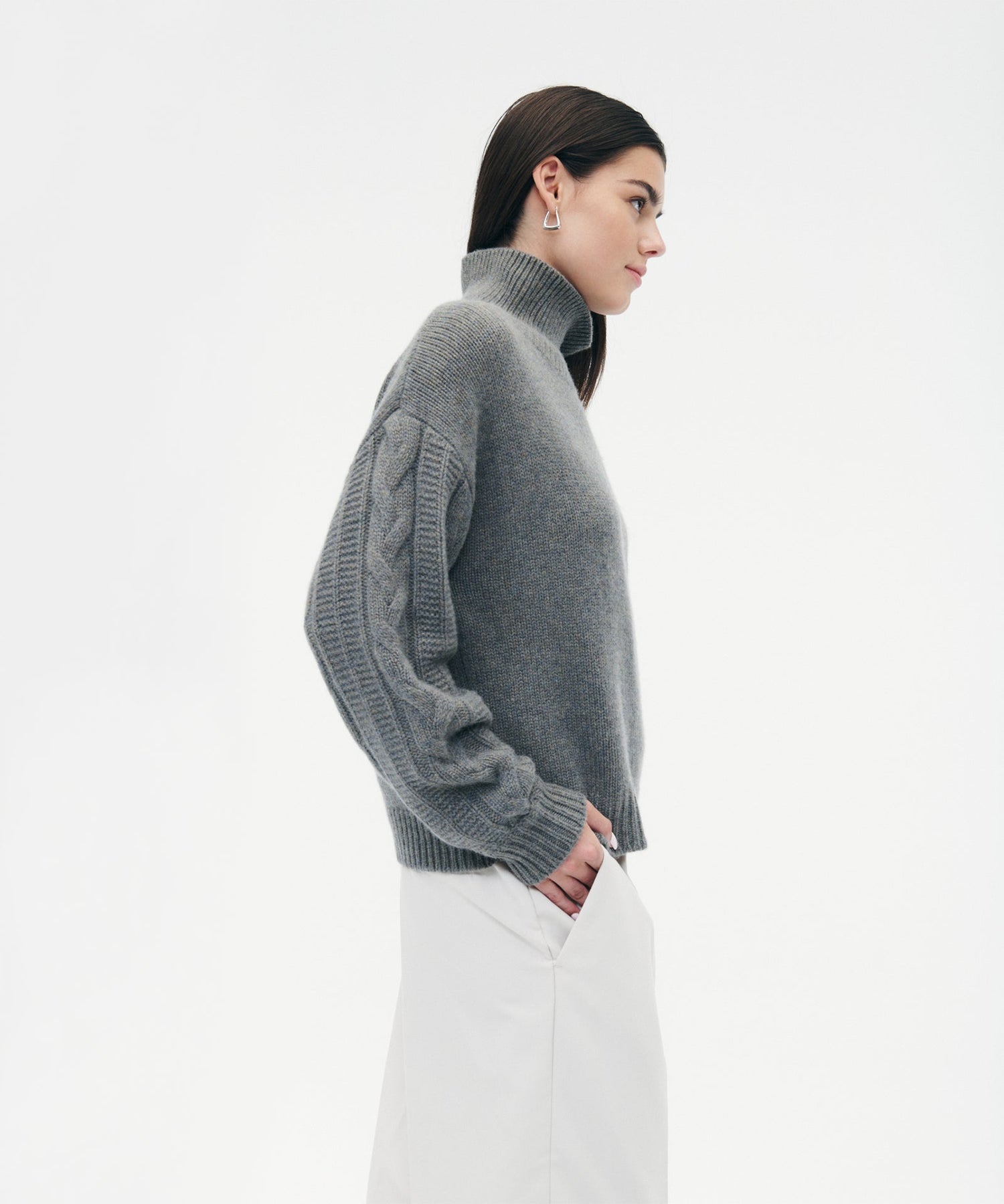 Statement sleeeve. The Merino Cashmere Cable Turtleneck redefines the cold weather classic with a roll neck collar, textured sleeves and ribbing at the cuffs and hems. Wear it with jeans or style it over a slip dress for a look that's as chic as it is cozy.