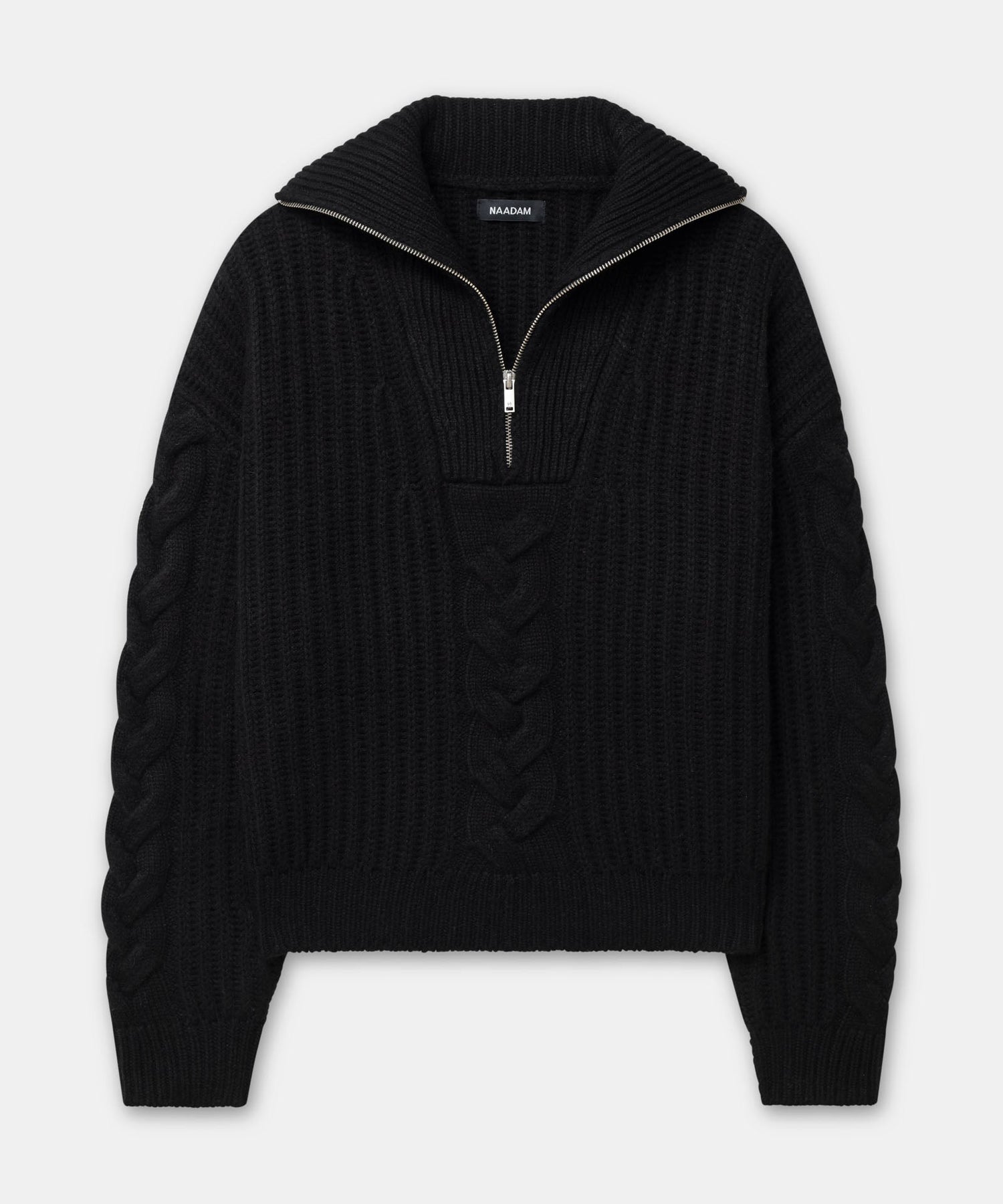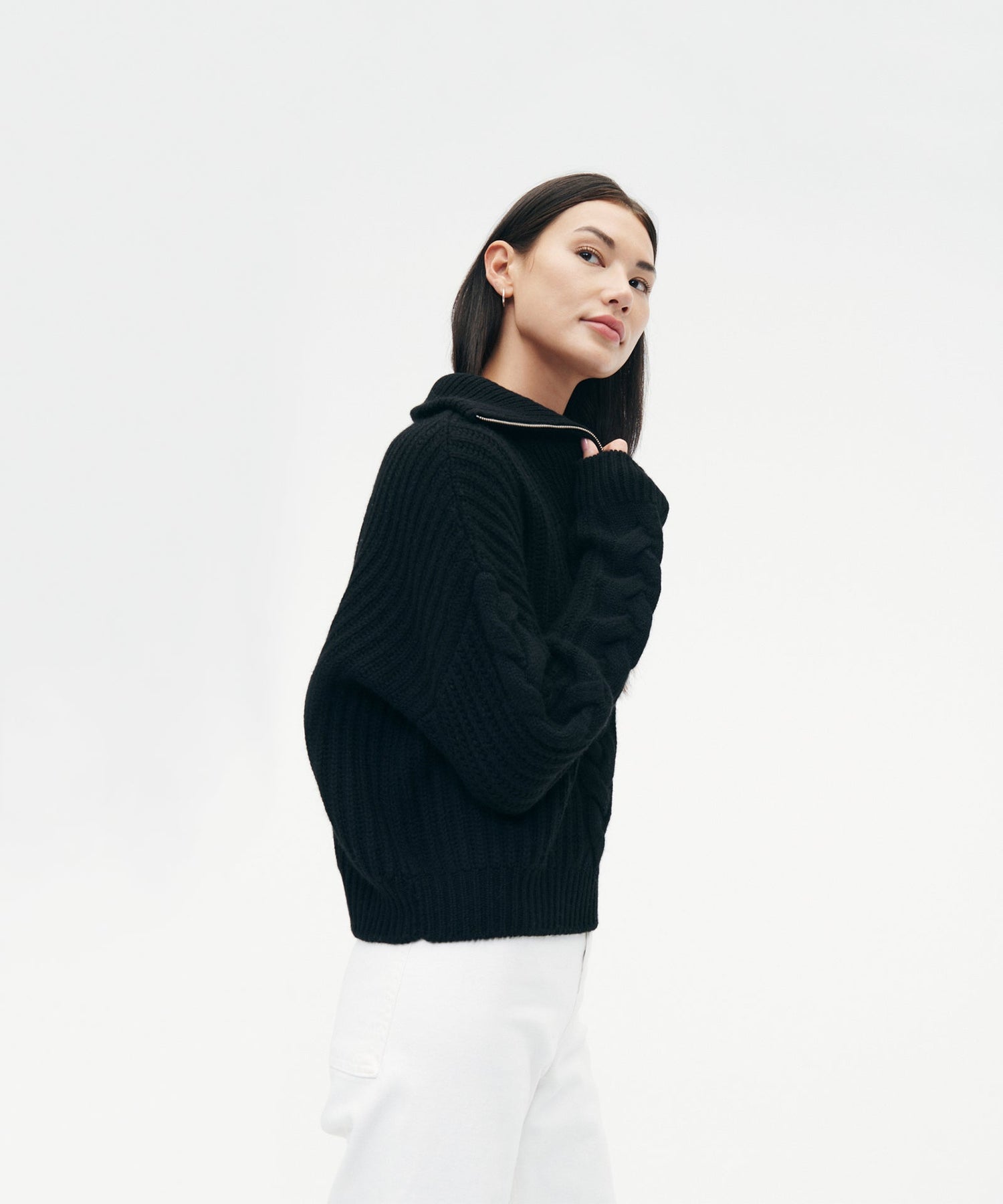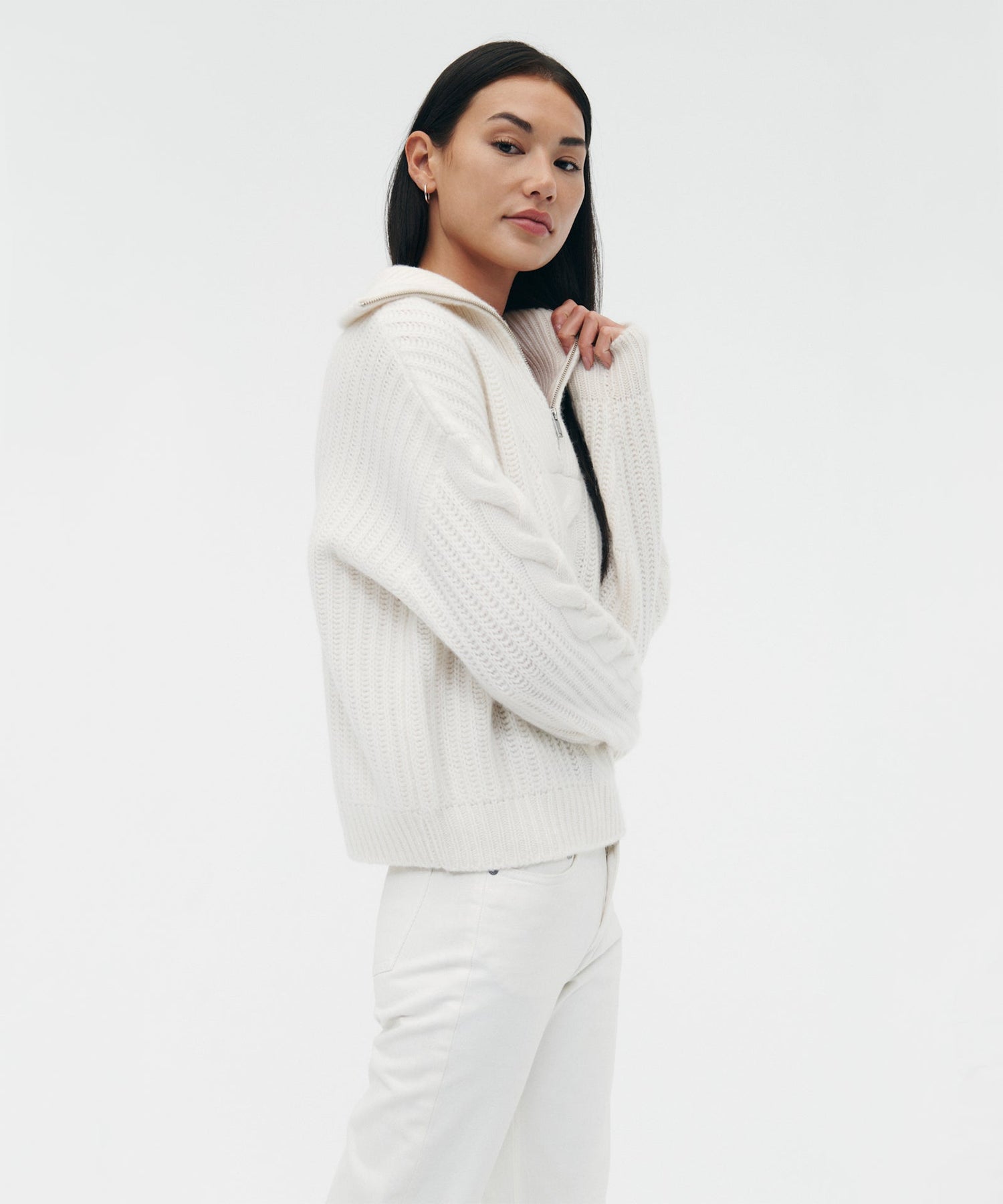 The Merino Cashmere Cable Quarter Zip is the après-ski sweater of your dreams, no skiing required. With exaggerated, thick cable knit details, gathered cuffs and hem and a luxe, wide ribbed fold-down collar, it's as chic on the sidewalk as it is on the slopes. Channel your inner snow bunny, you won't regret it.