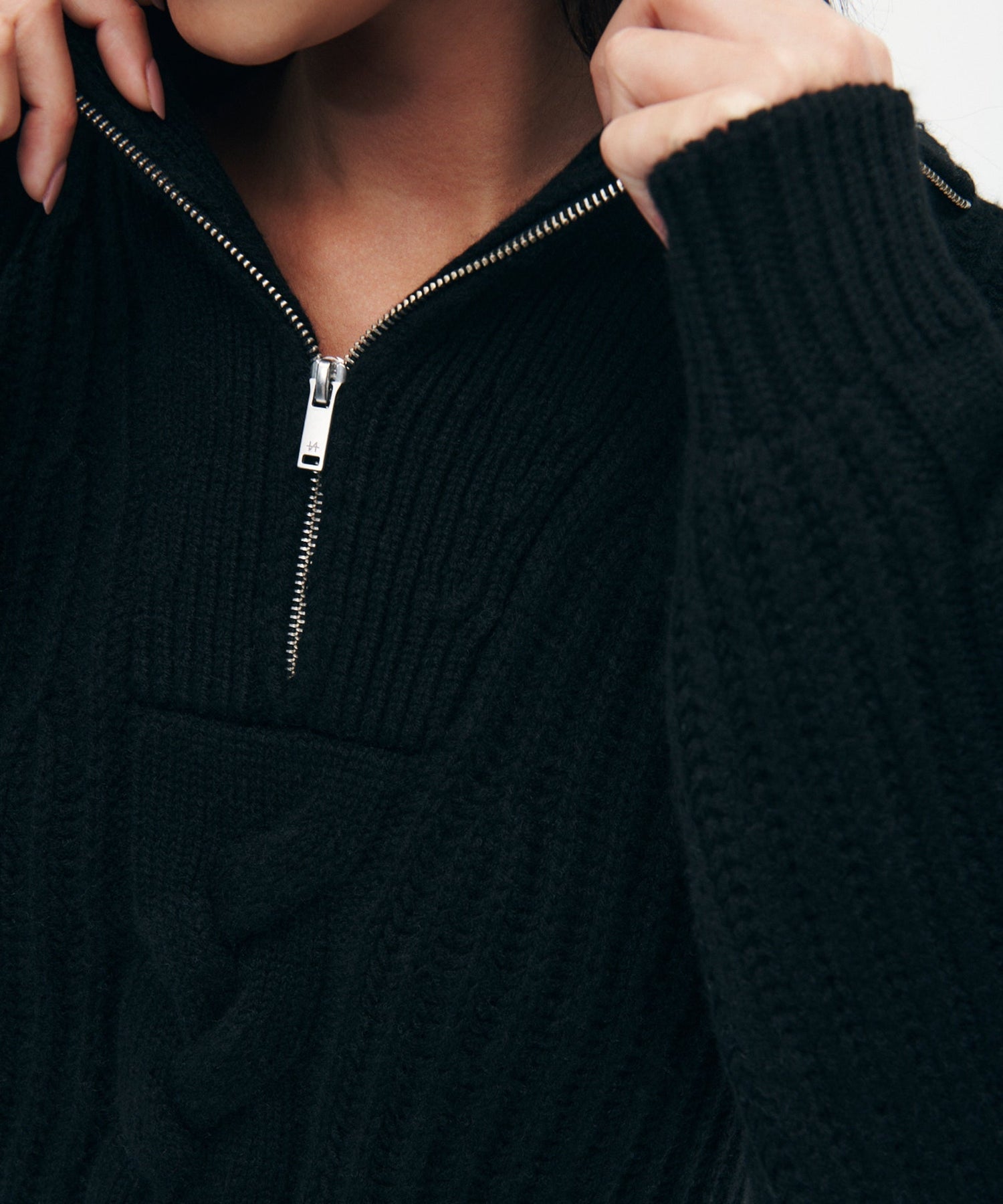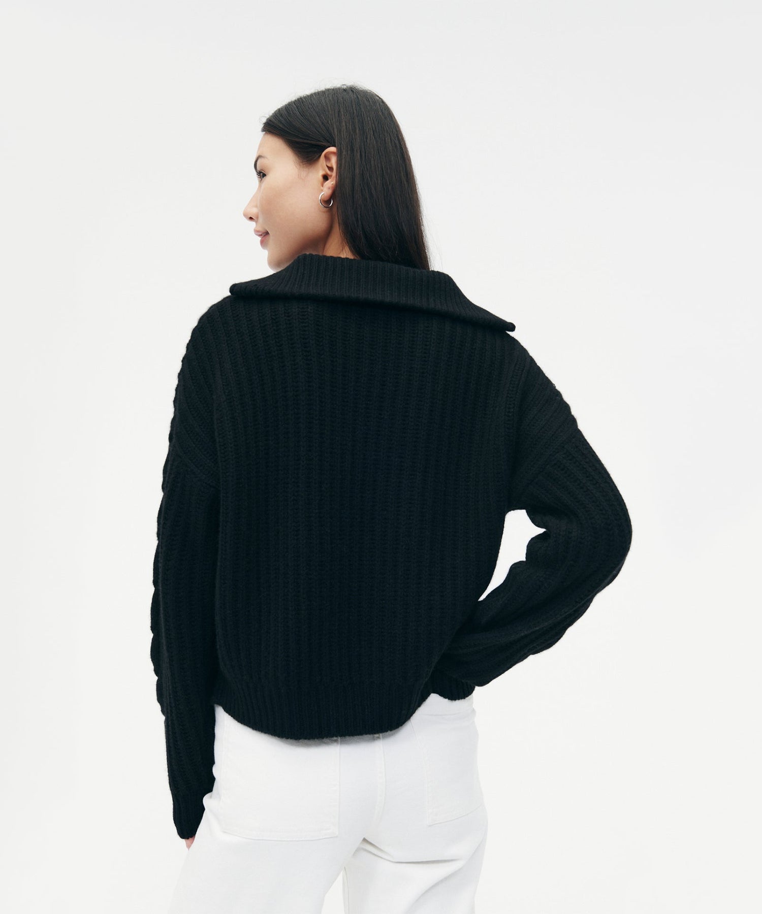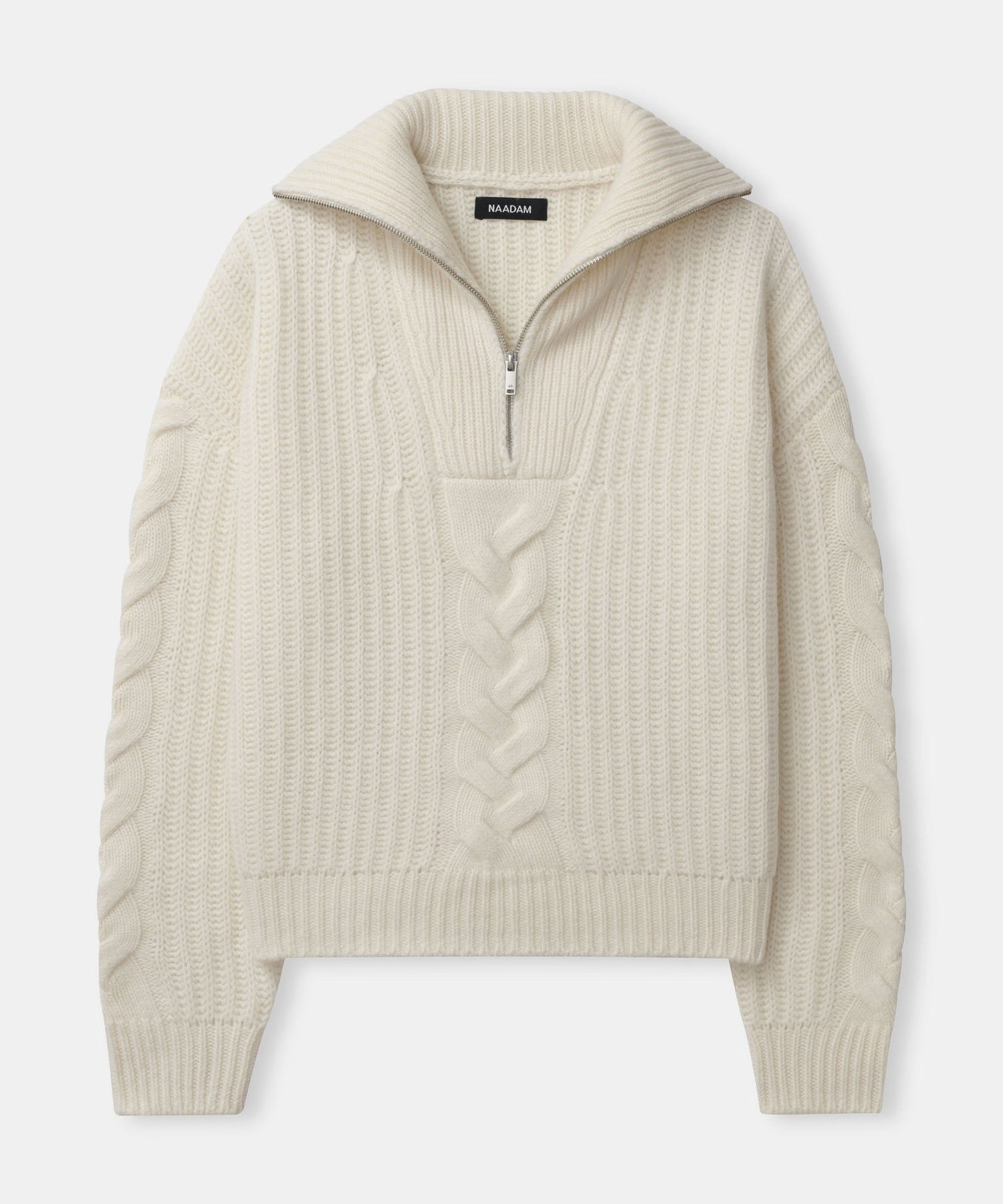 The Merino Cashmere Cable Quarter Zip is the après-ski sweater of your dreams, no skiing required. With exaggerated, thick cable knit details, gathered cuffs and hem and a luxe, wide ribbed fold-down collar, it's as chic on the sidewalk as it is on the slopes. Channel your inner snow bunny, you won't regret it.
