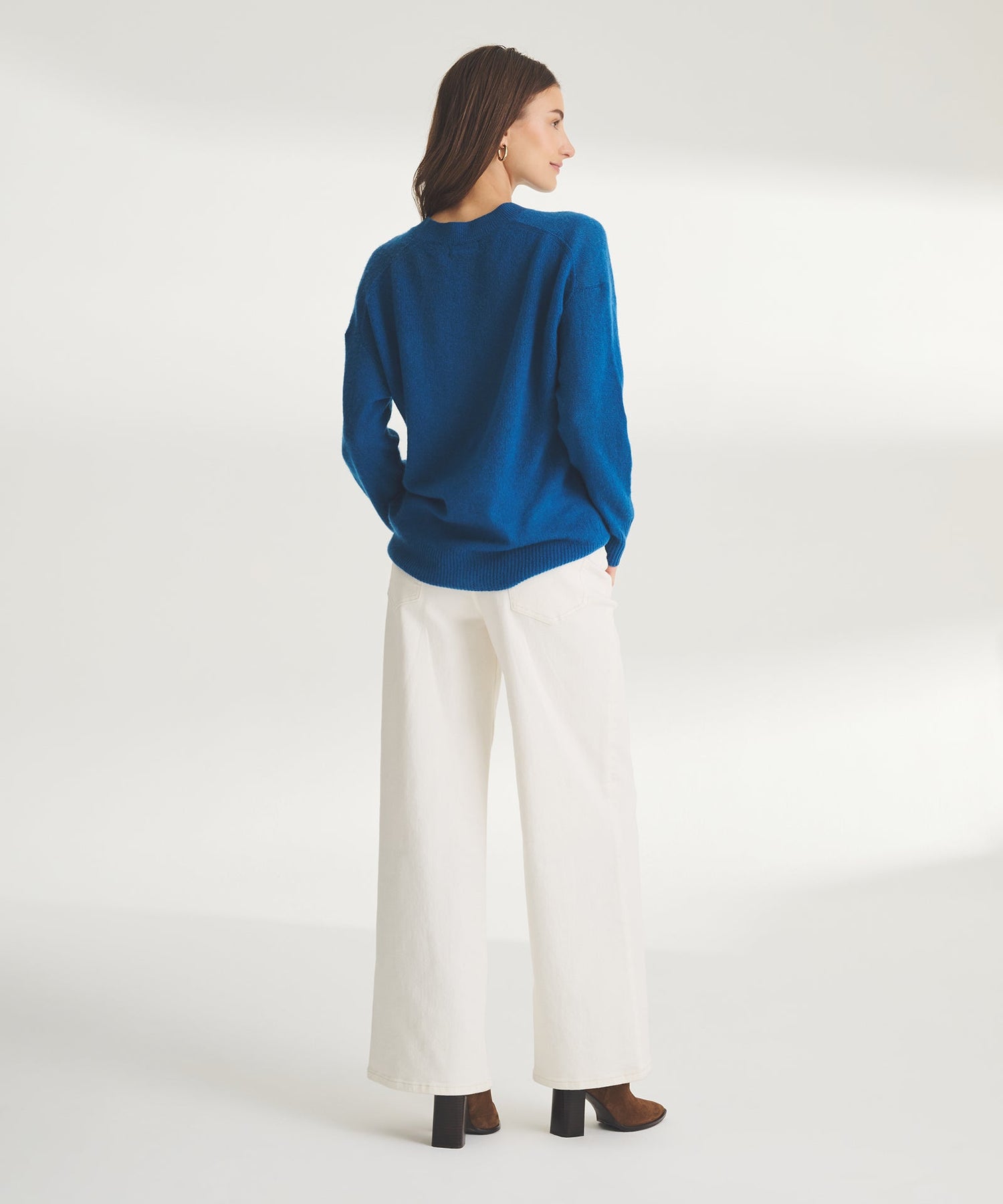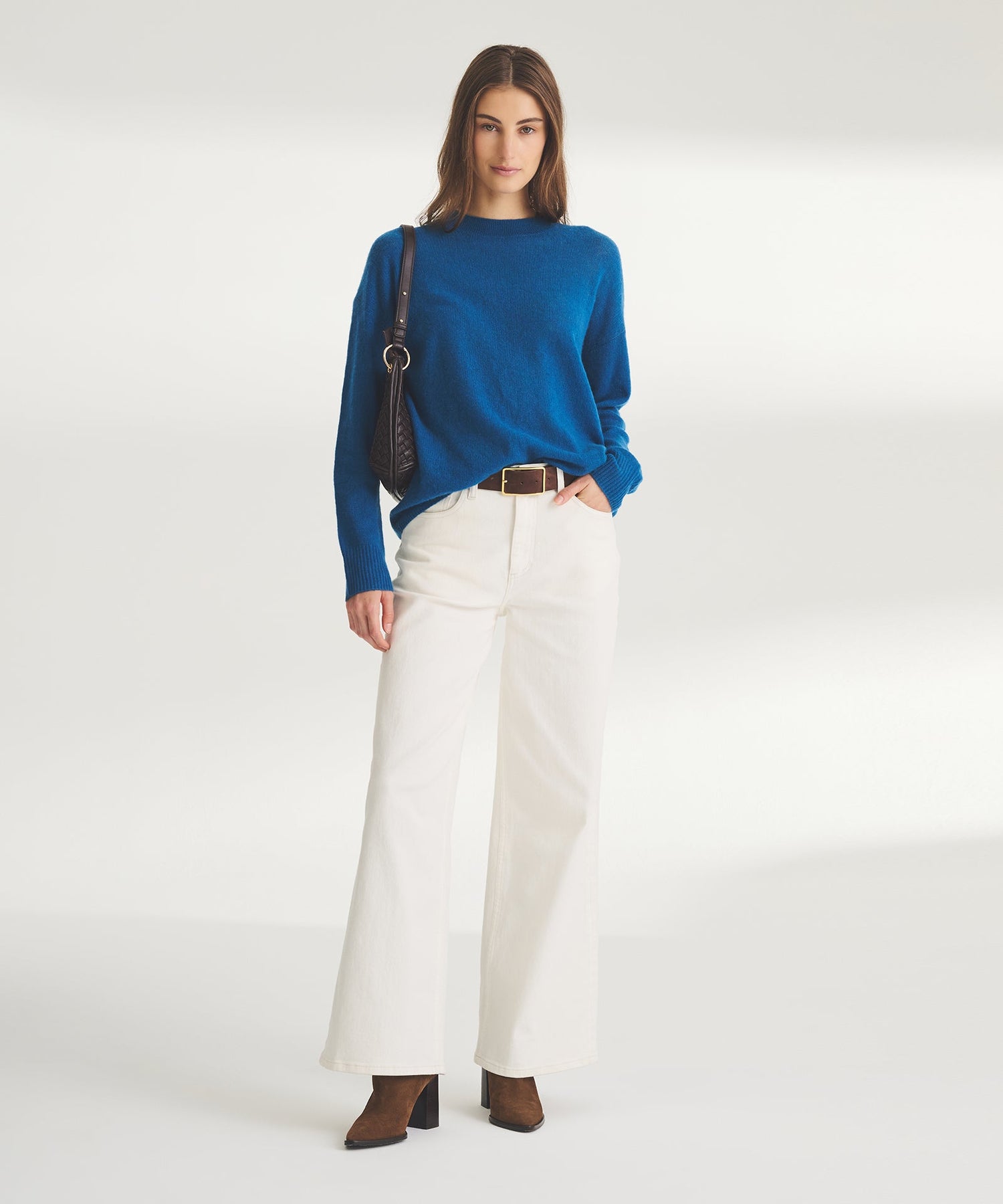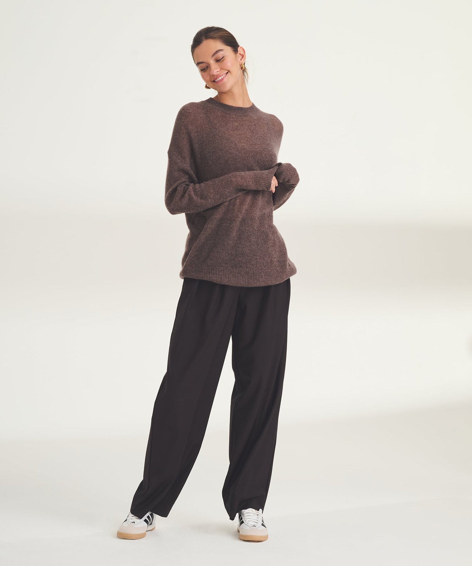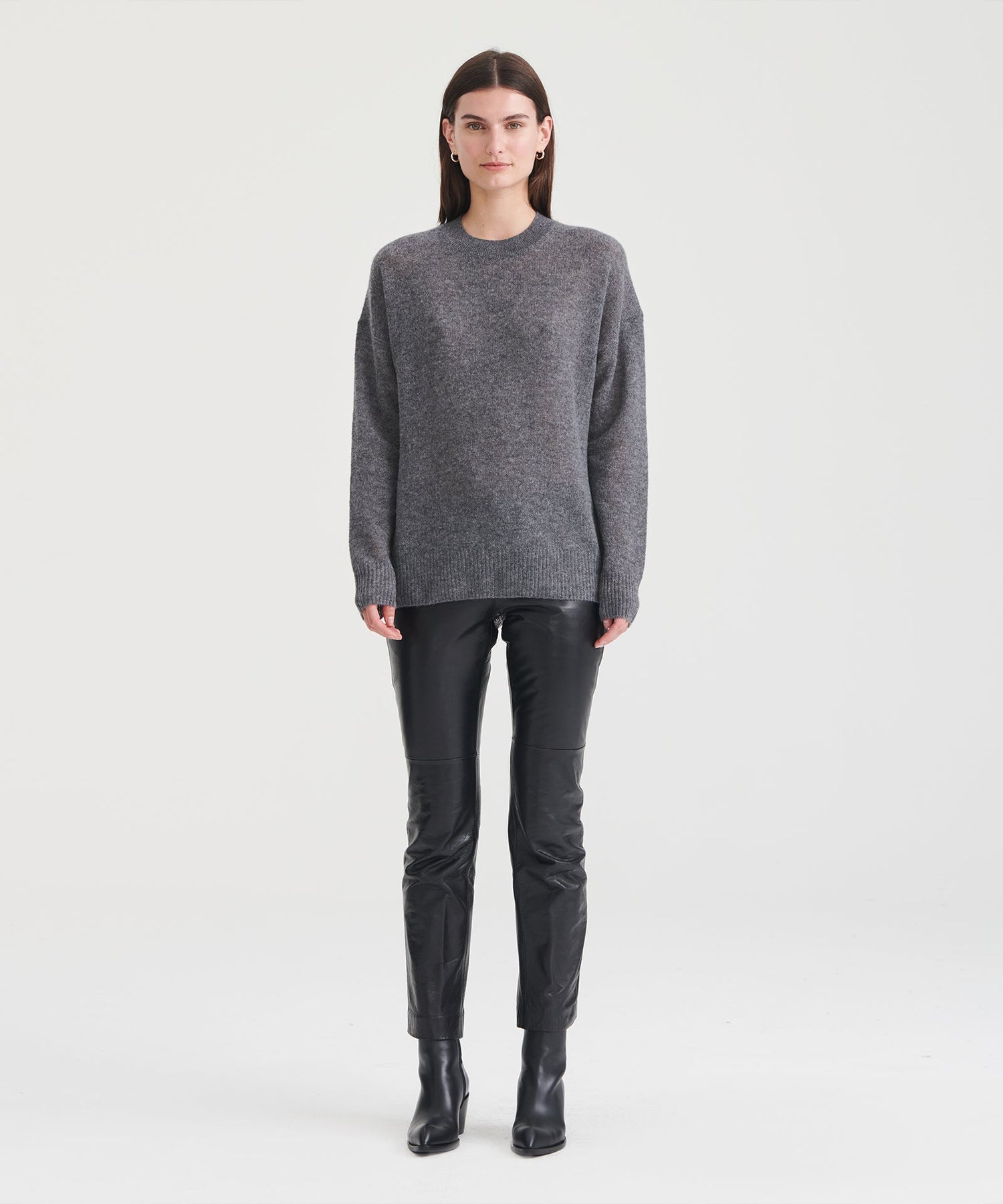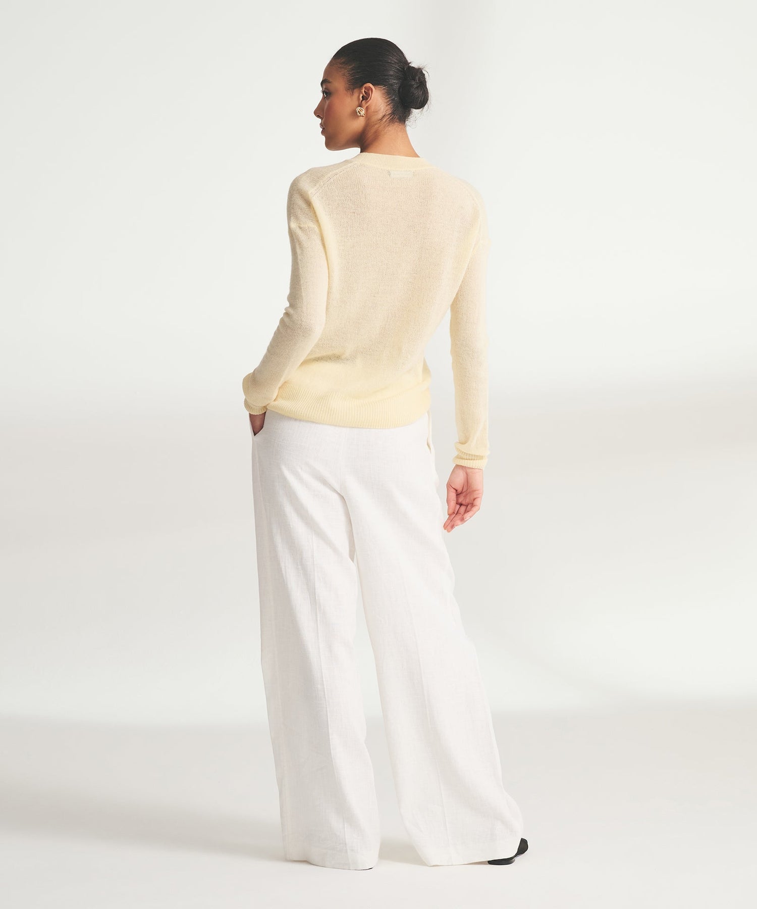 The Featherweight Cashmere Crewneck Sweater is a delicate, lightweight sweater with a relaxed classic fit and long classic length designed to sit at the center of the hips. It features a crew neckline, drop shoulders, and ribbed details. Crafted from a sheer, finely knit cashmere.