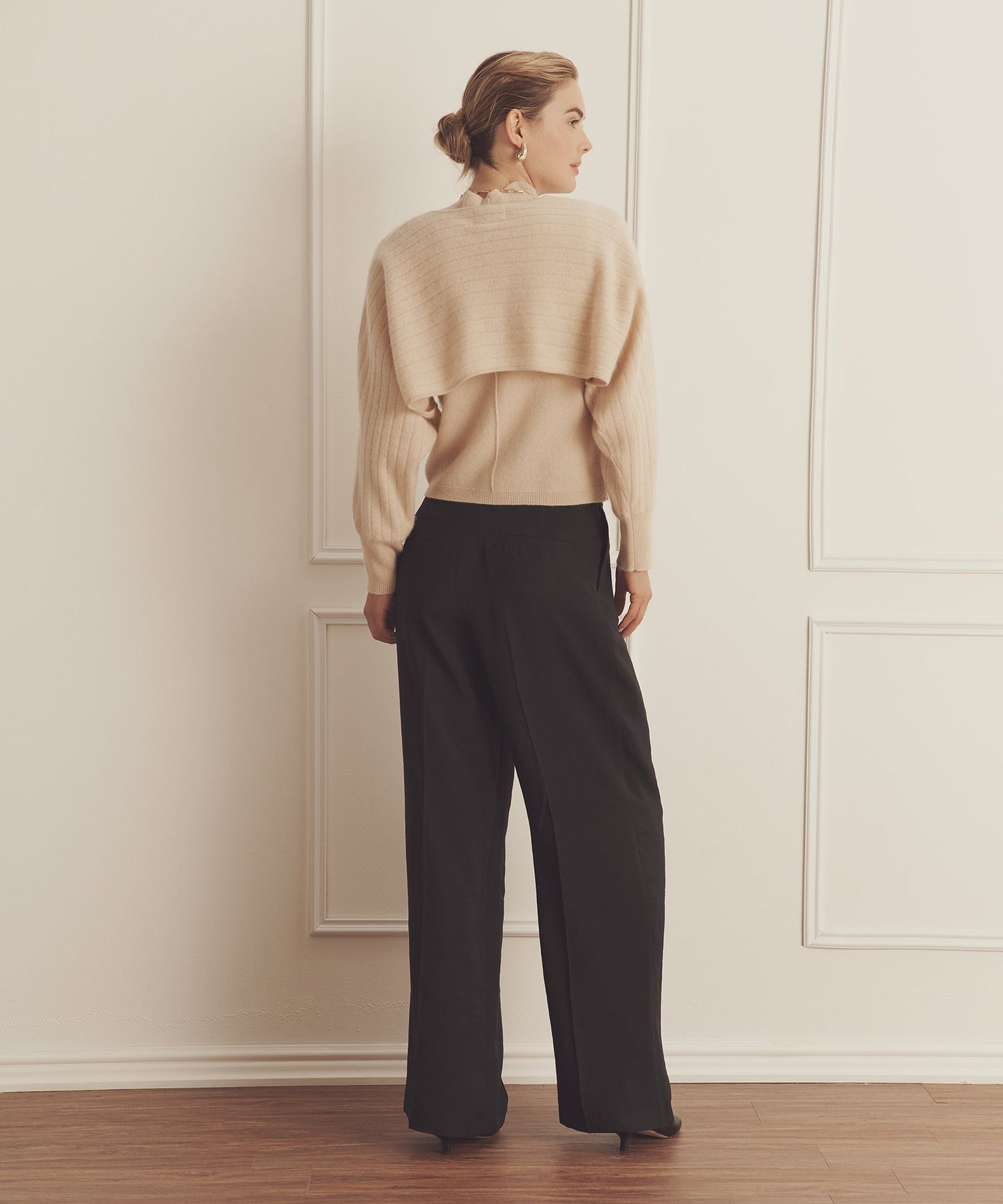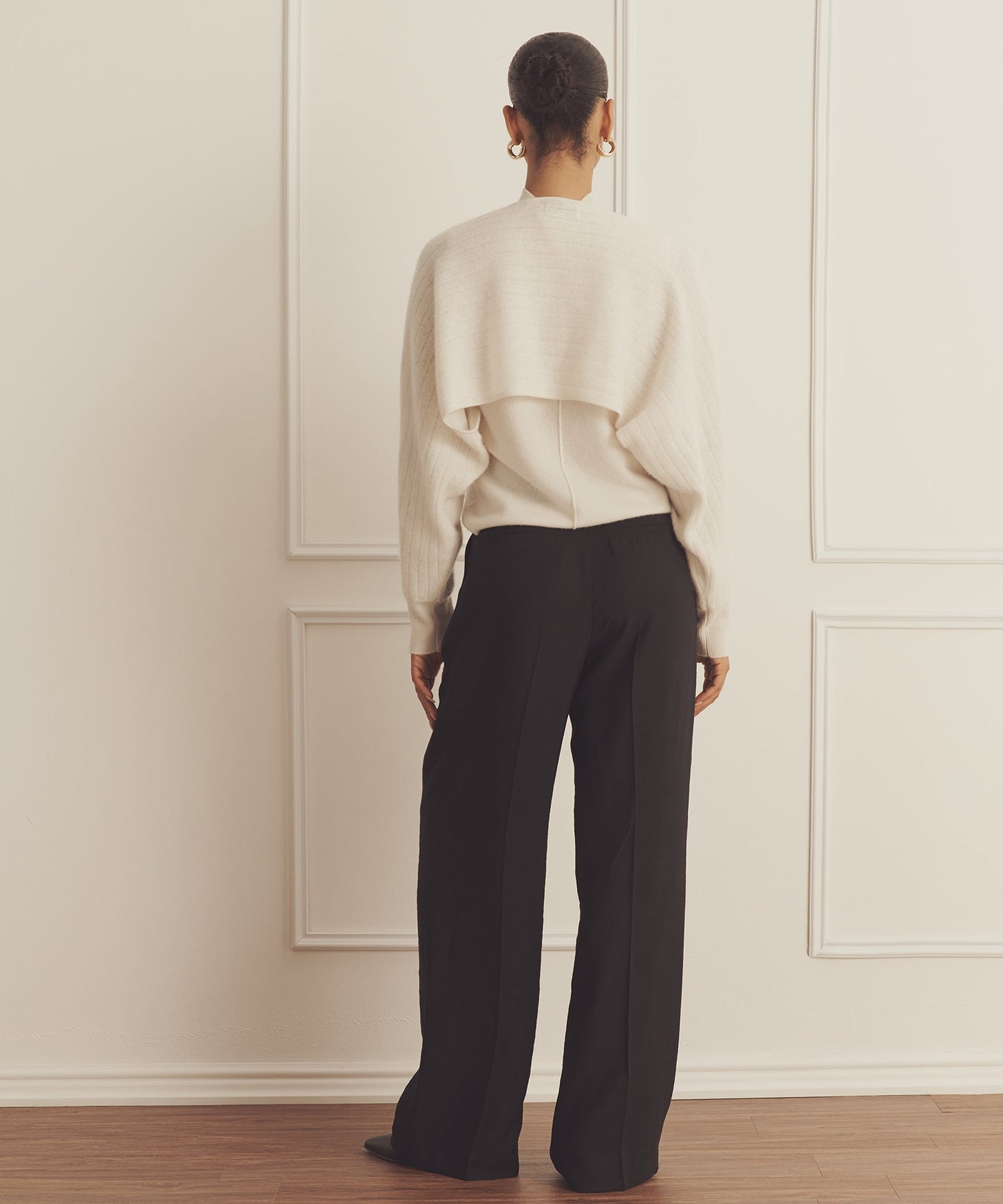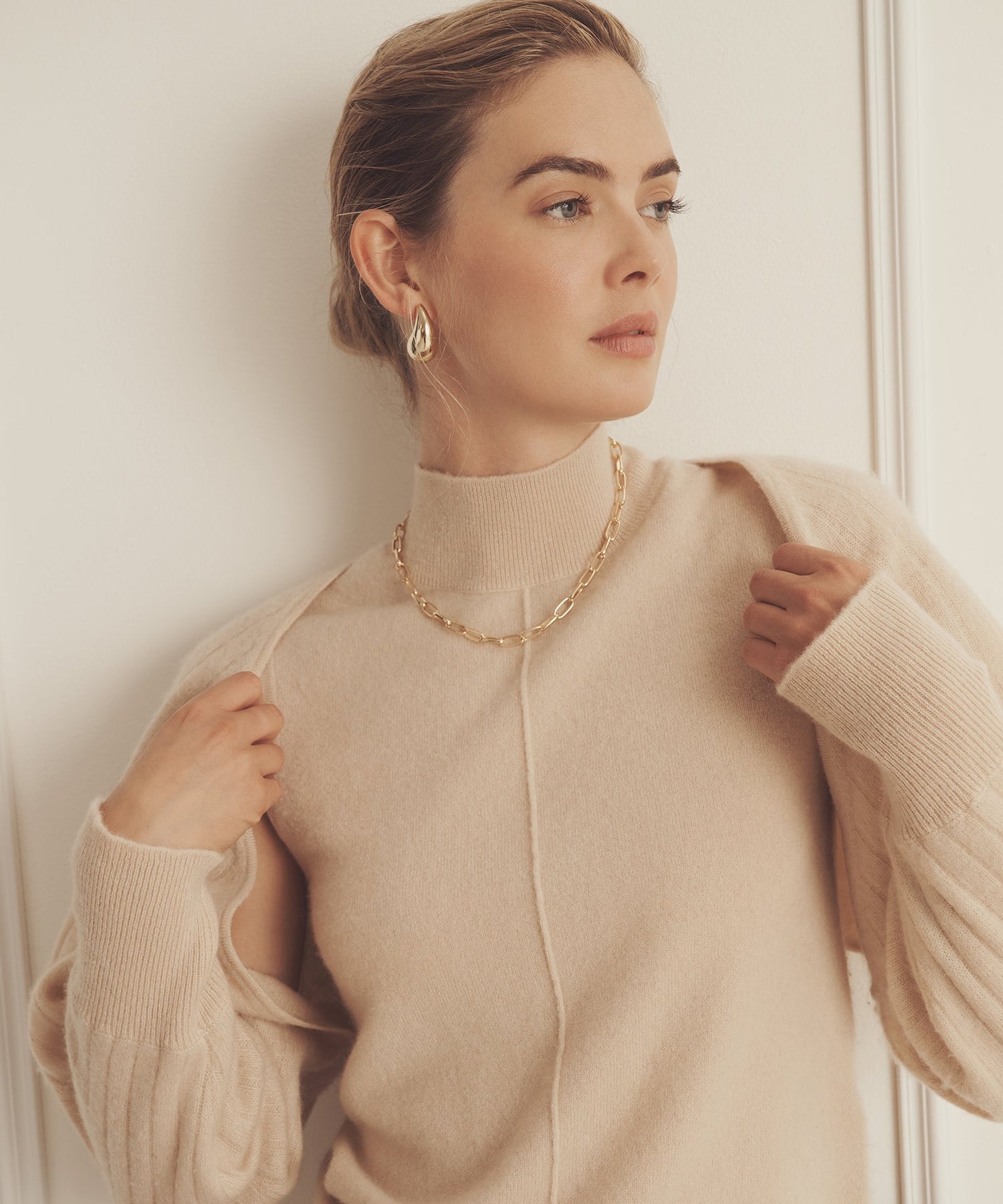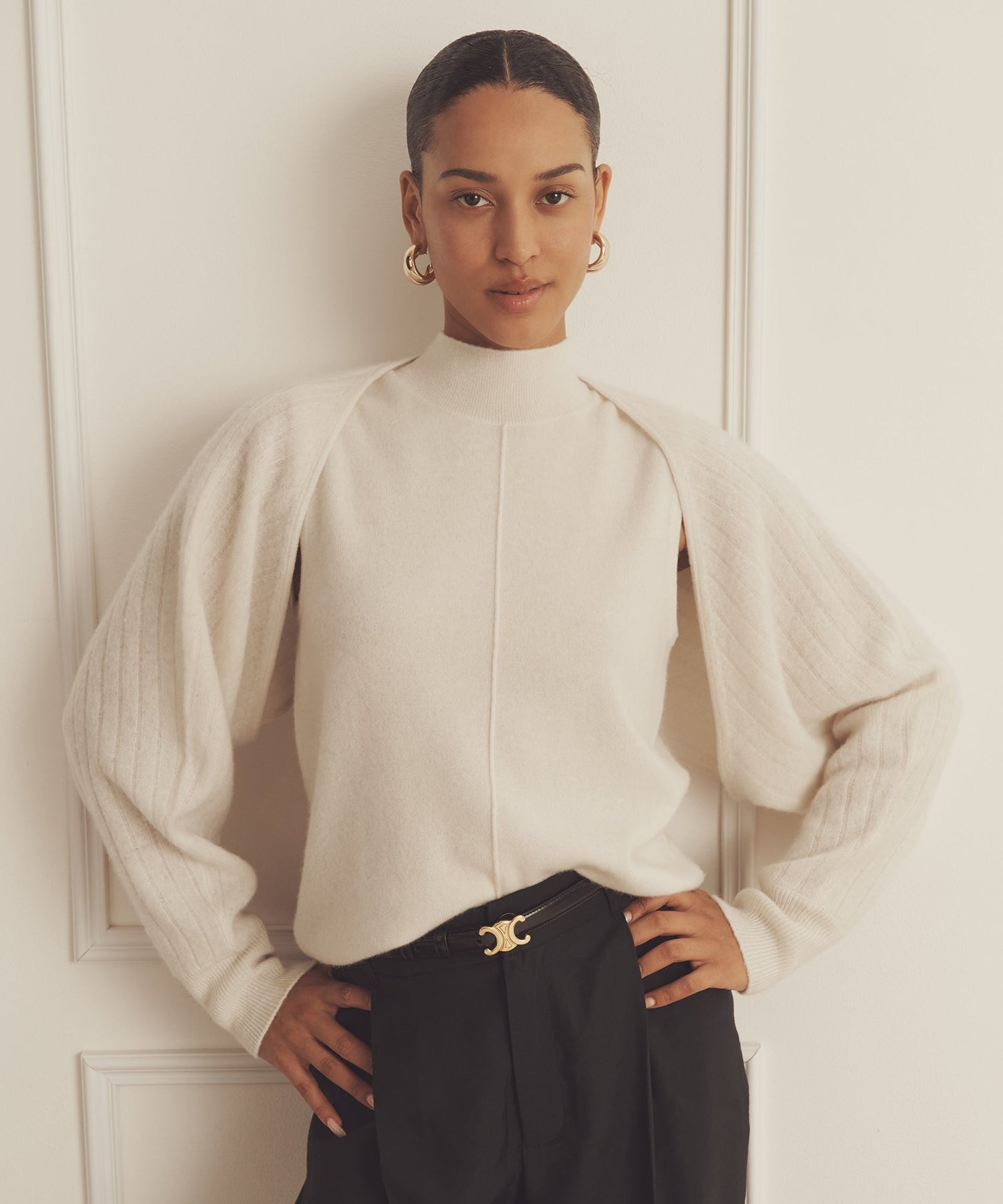 Covered in cashmere. The Novelty Cashmere Two Piece Turtleneck Set is an heirloom-worthy pair with a classic fit and short classic length. It features a reversible sleeveless turtleneck with center seam and button back, along with a ribbed bolero for added visual interest. Crafted entirely from 100% premium cashmere.