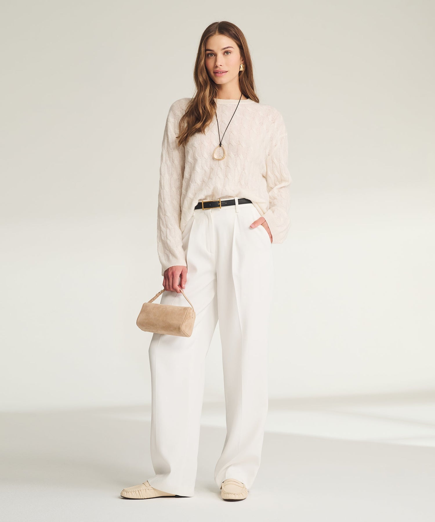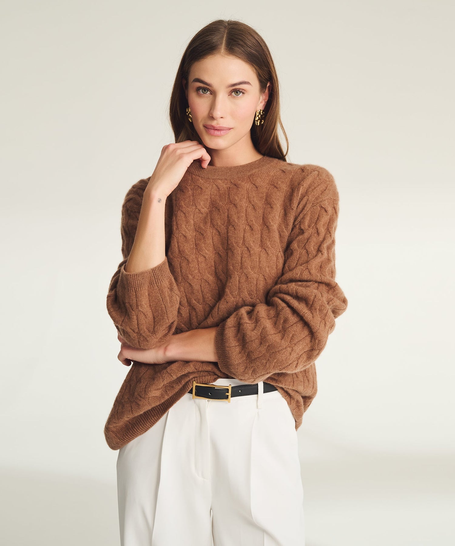 An airy affair. The Lightweight Cashmere Cable Oversized Crewneck Sweater is crafted from breathable, lightweight cashmere with classic cable detailing. Designed with an oversized fit and extended length, it drapes effortlessly for a modern, relaxed silhouette.