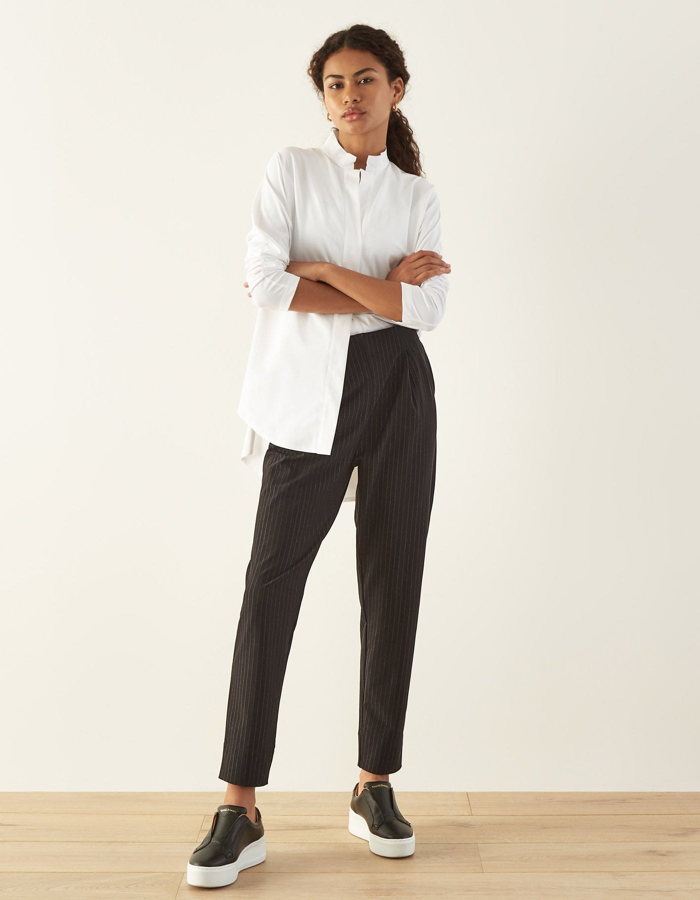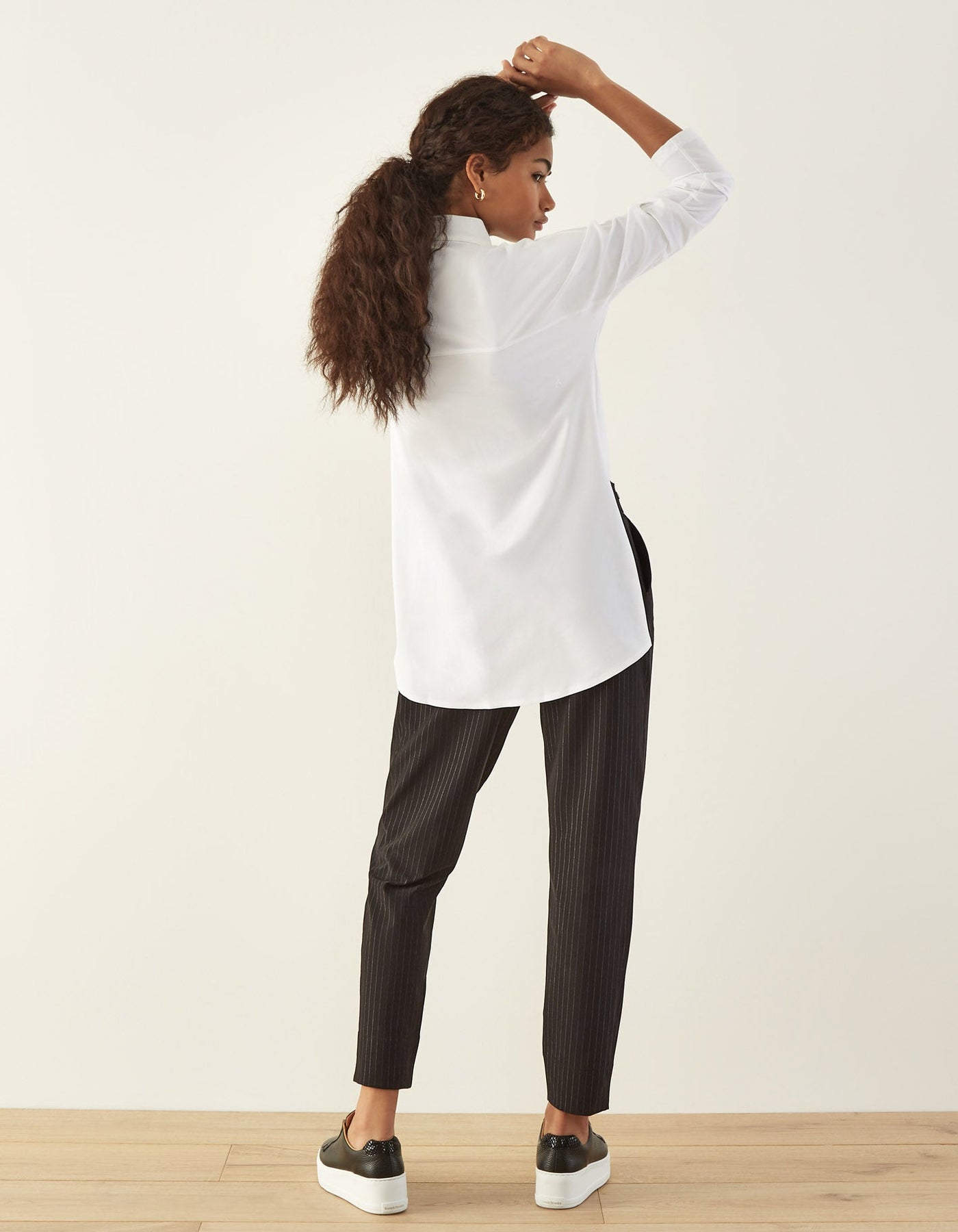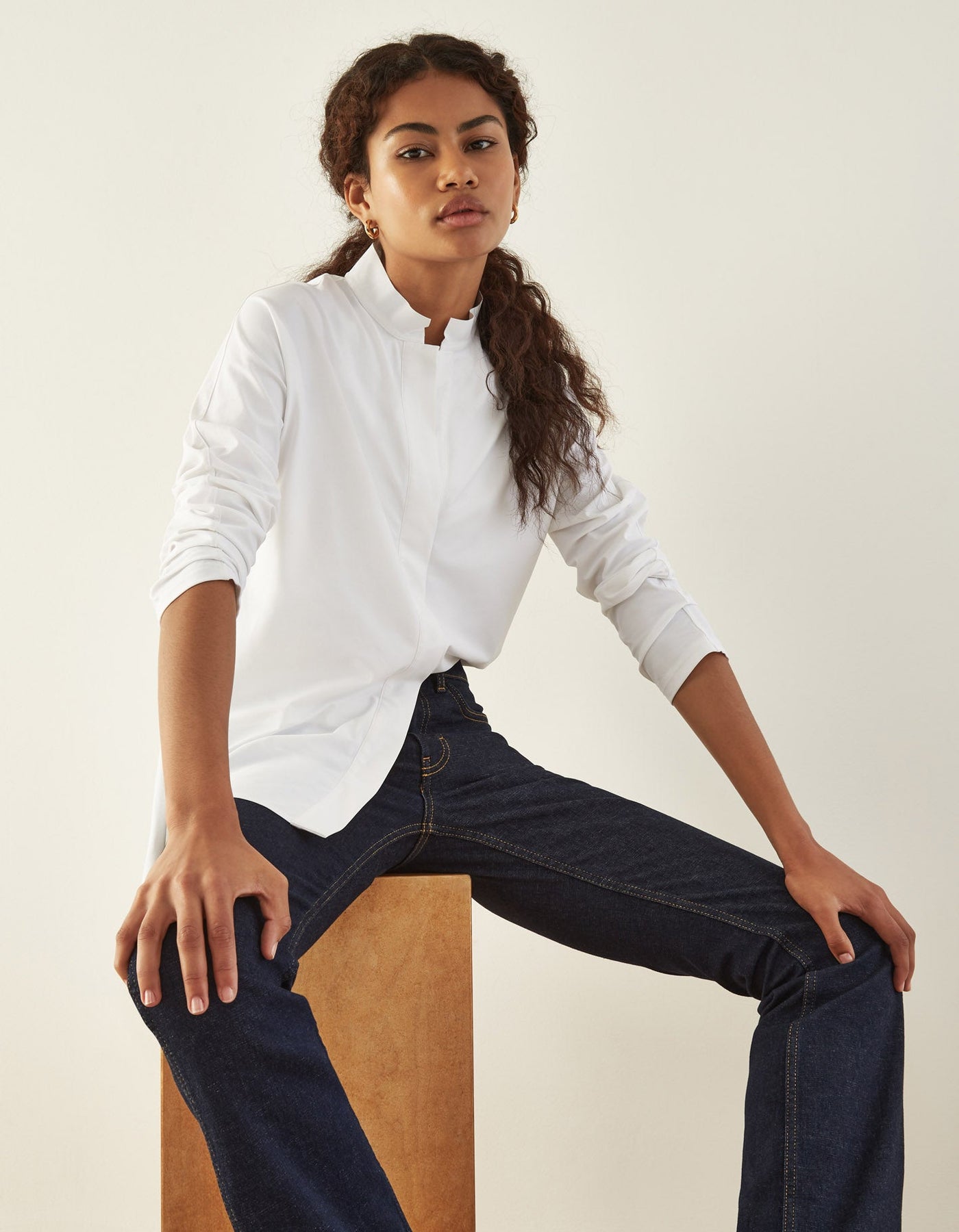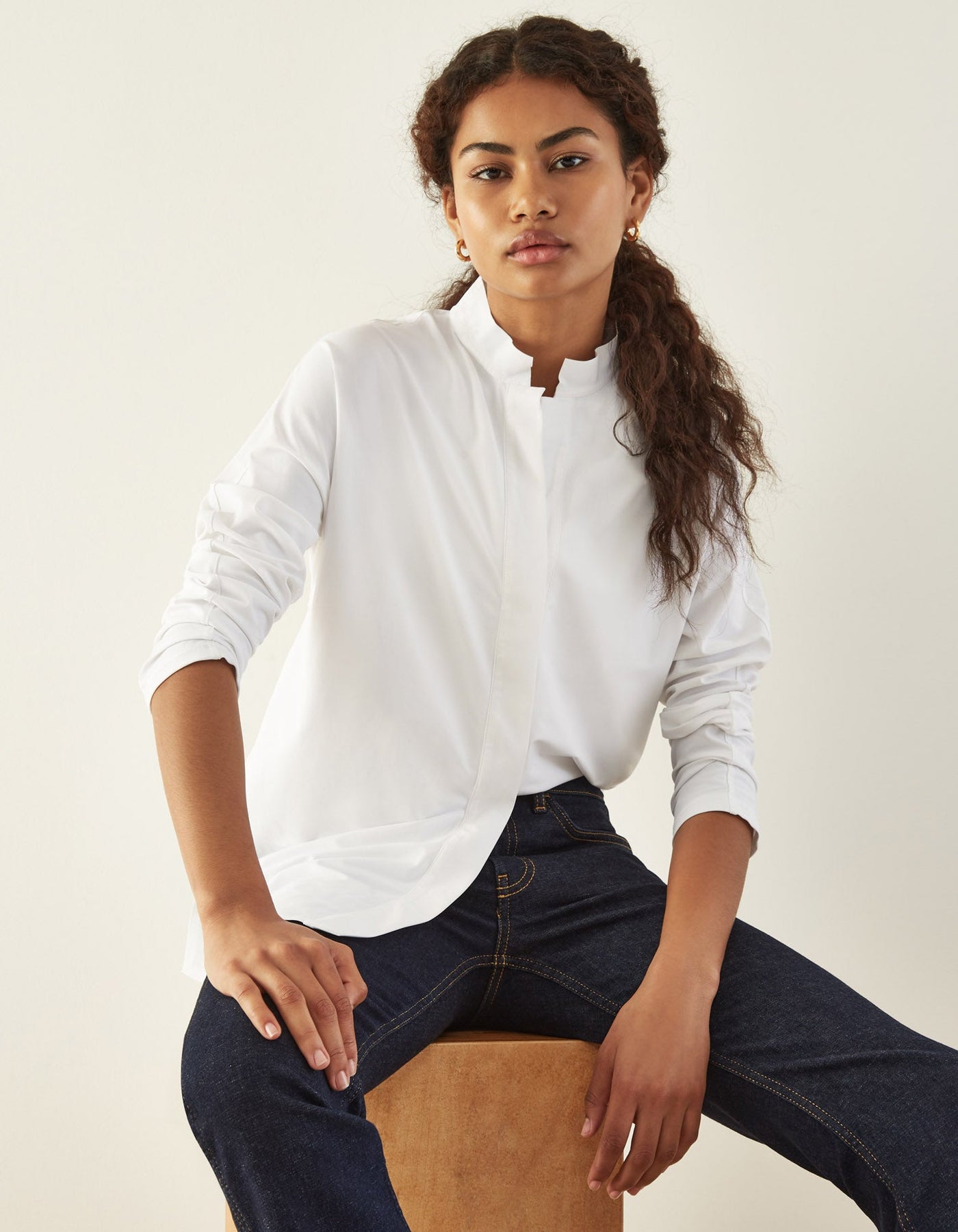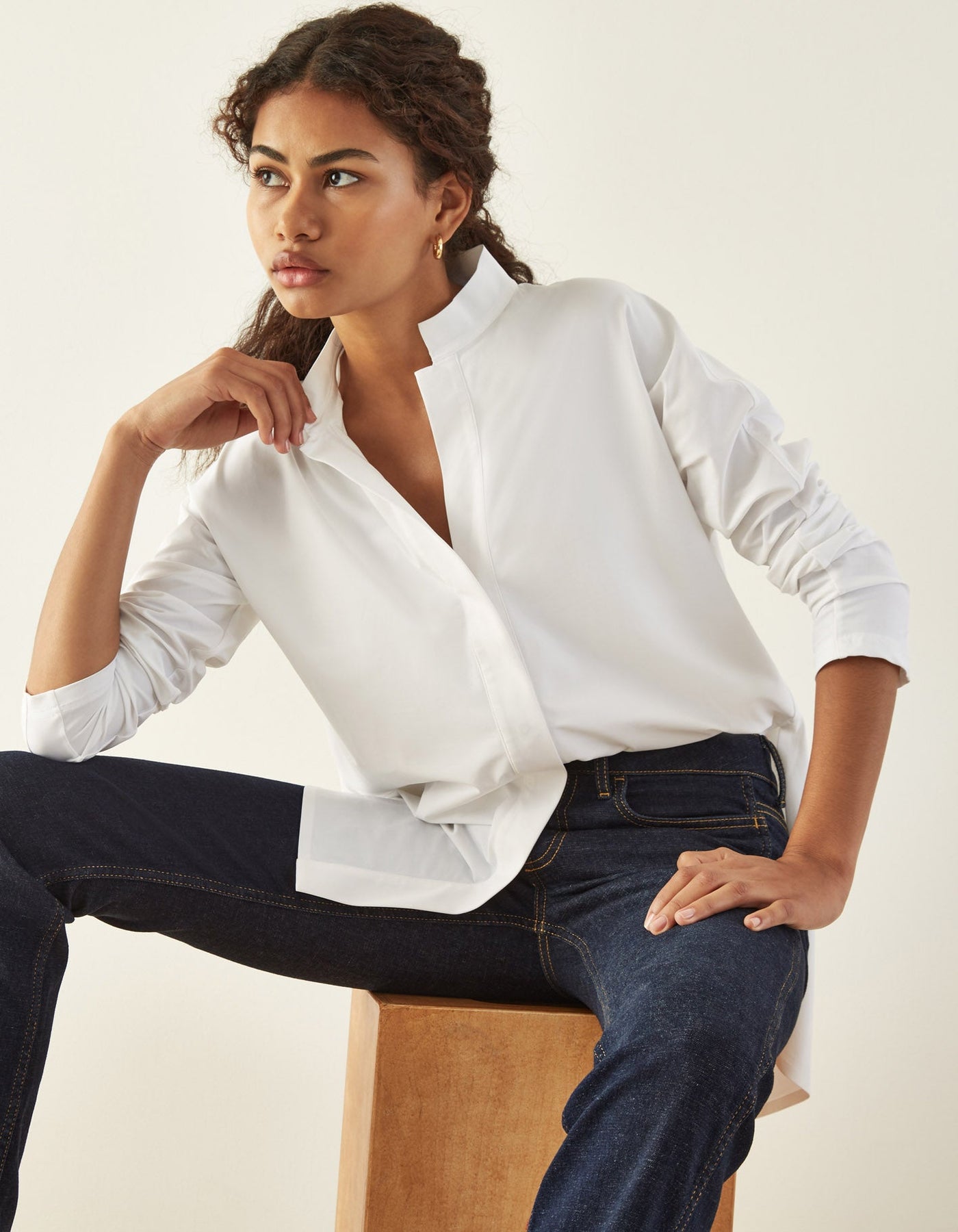 The most flattering button up you'll ever own. This modern twist on a boyfriend shirt features a relaxed silhouette, a chic mandarin collar, and a silky hand-feel.