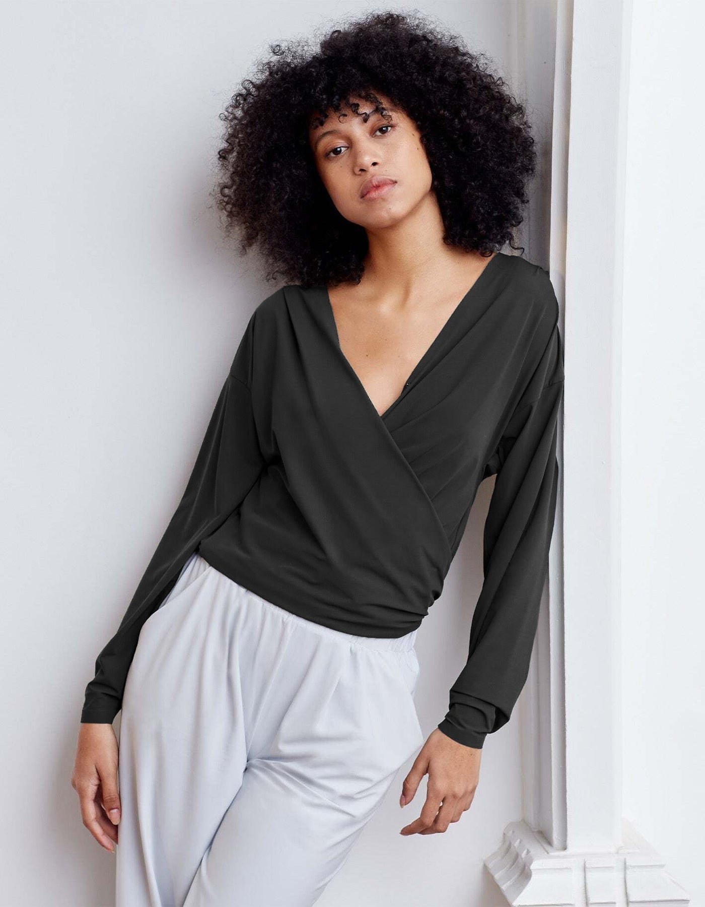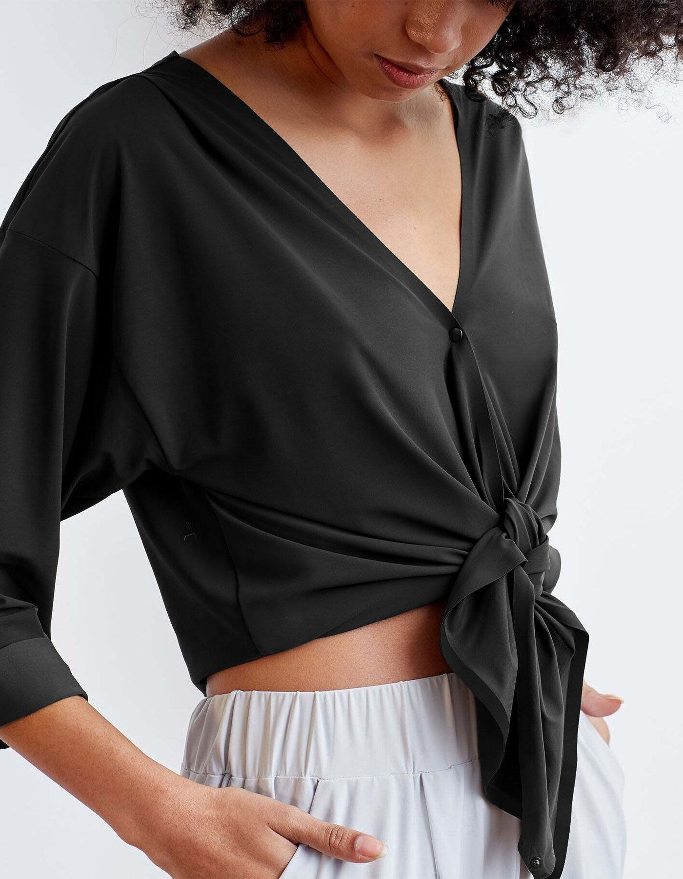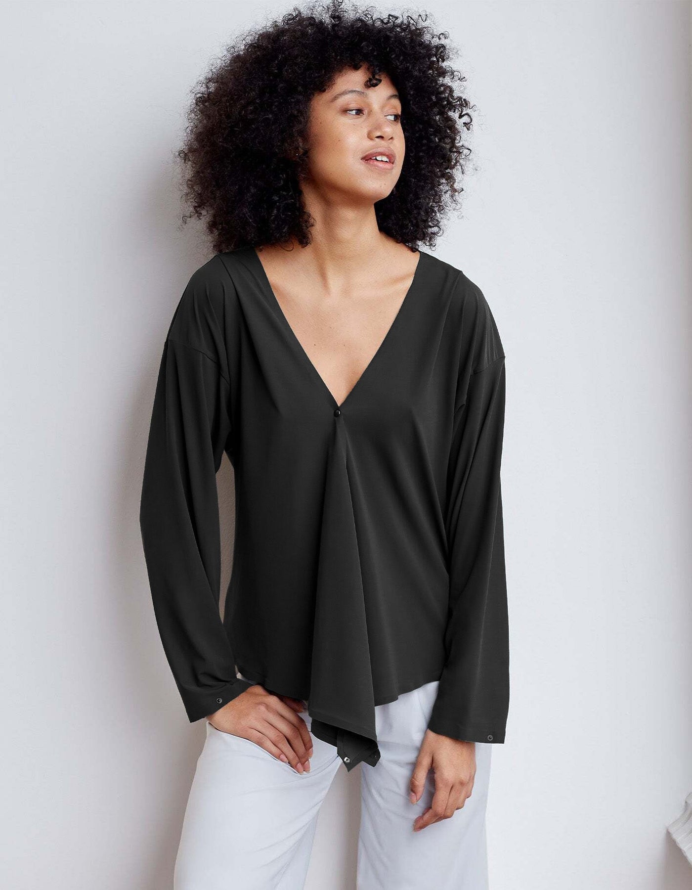 Versatile and universally flattering, our loose fitting wrap blouse can be tied, draped, snapped and wrapped multiple ways. This product runs large. We recommend sizing down.