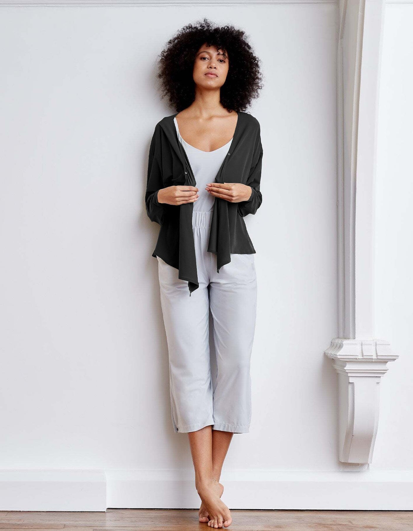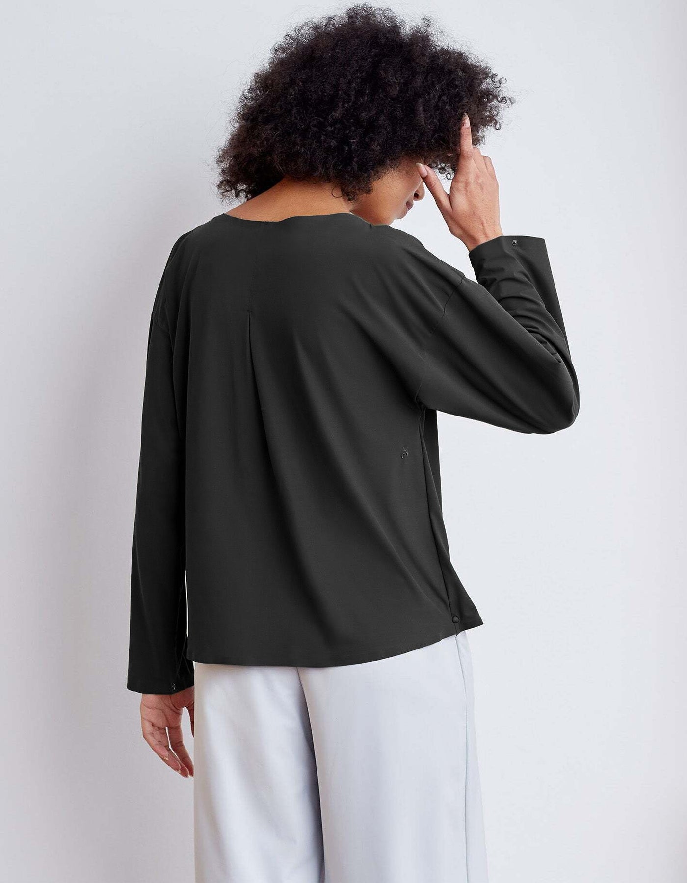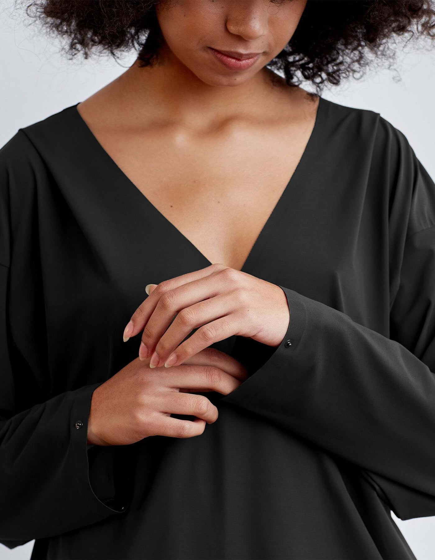 Versatile and universally flattering, our loose fitting wrap blouse can be tied, draped, snapped and wrapped multiple ways. This product runs large. We recommend sizing down.