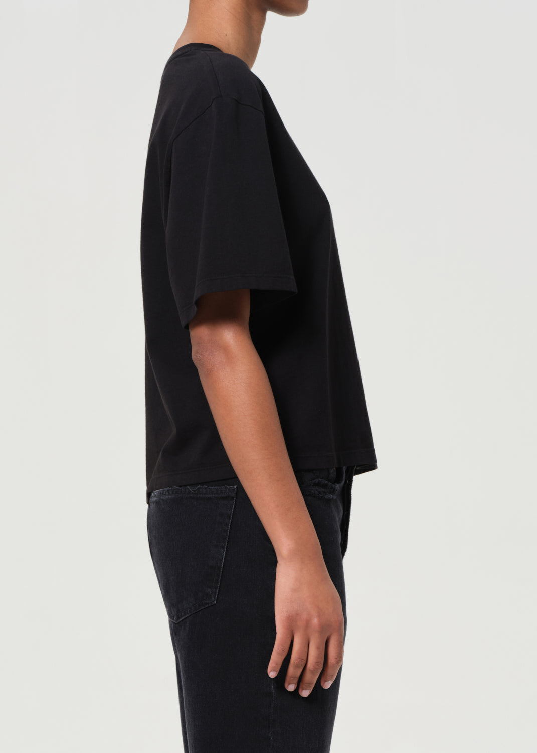 The Sulma Tee is a structured t-shirt designed with drop shoulders for a relaxed yet refined look. Its clean, tailored silhouette offers a modern take on the classic tee, making it perfect for effortless styling. Pair it with high-waisted jeans or tucked into skirts for a chic, laid-back vibe.