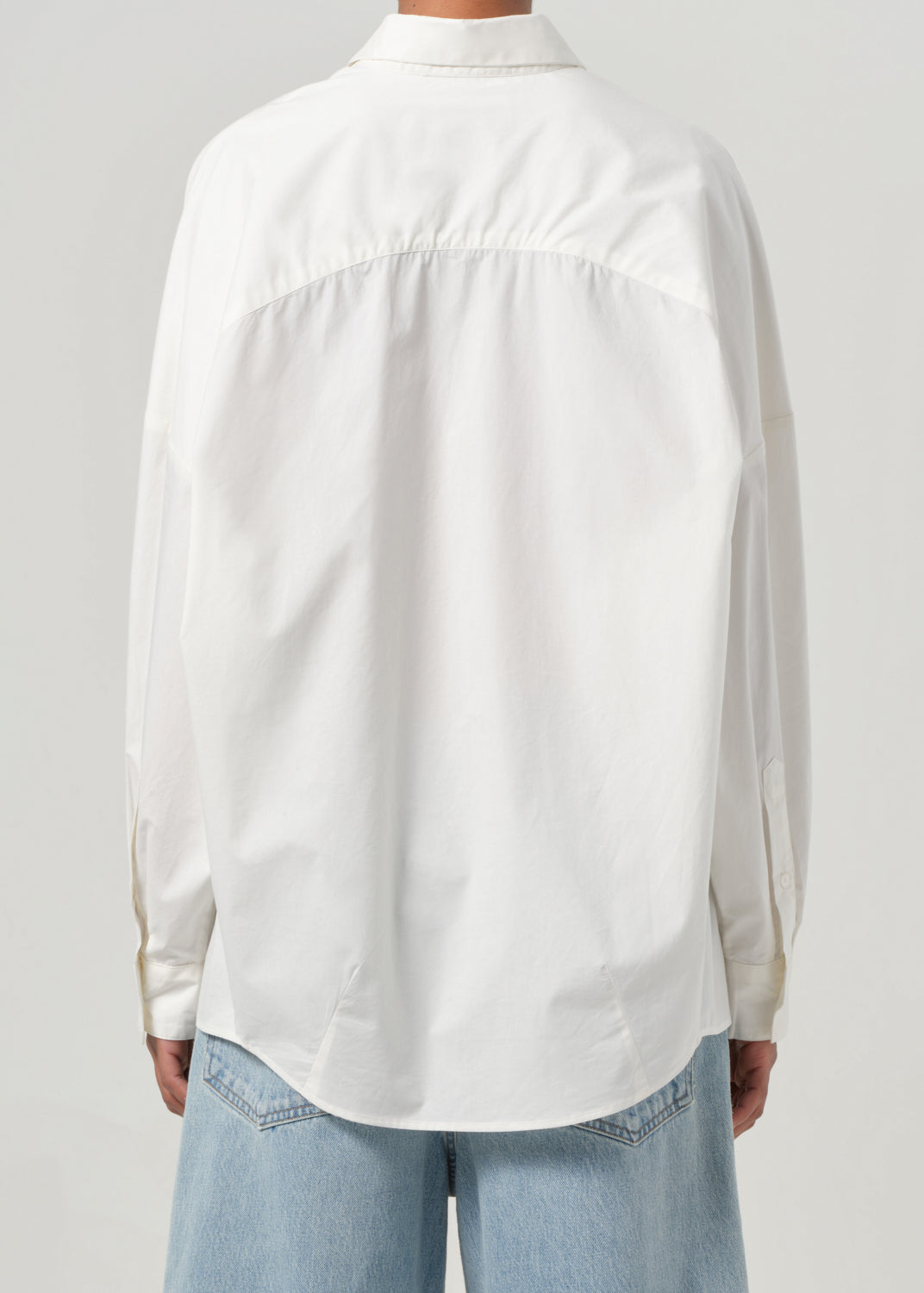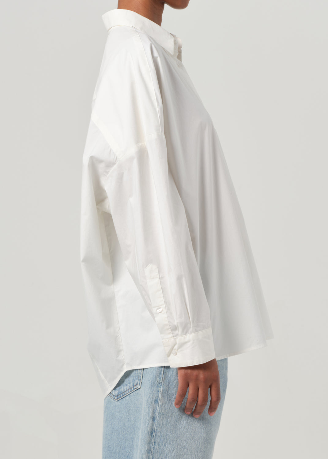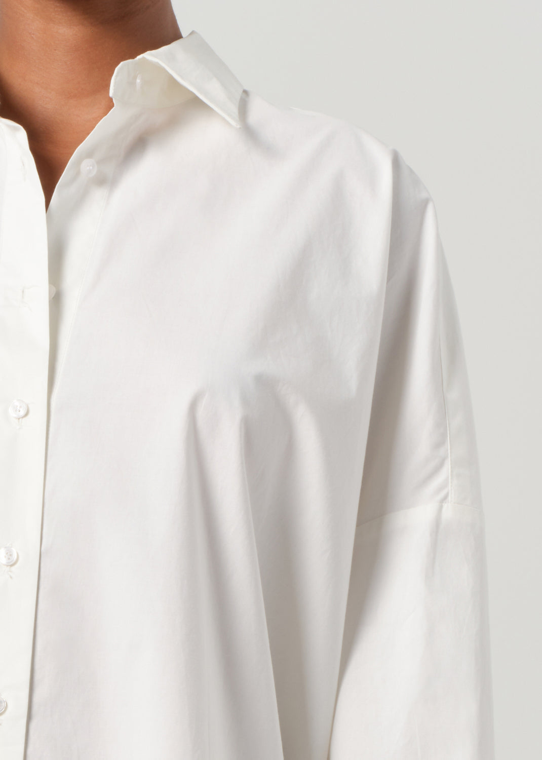 The Roux Shirt is a timeless white button-up reimagined with contemporary flair. Crafted from ultra-lightweight poplin cotton, it features voluminous balloon sleeves that add a modern, feminine touch. With its clean, crisp design and true-to-size fit, this long-sleeve shirt offers effortless sophistication for any occasion. Pair with relaxed denim or tailored trousers for a versatile, elevated look.