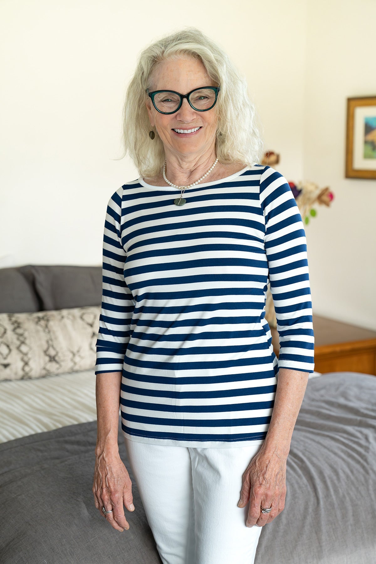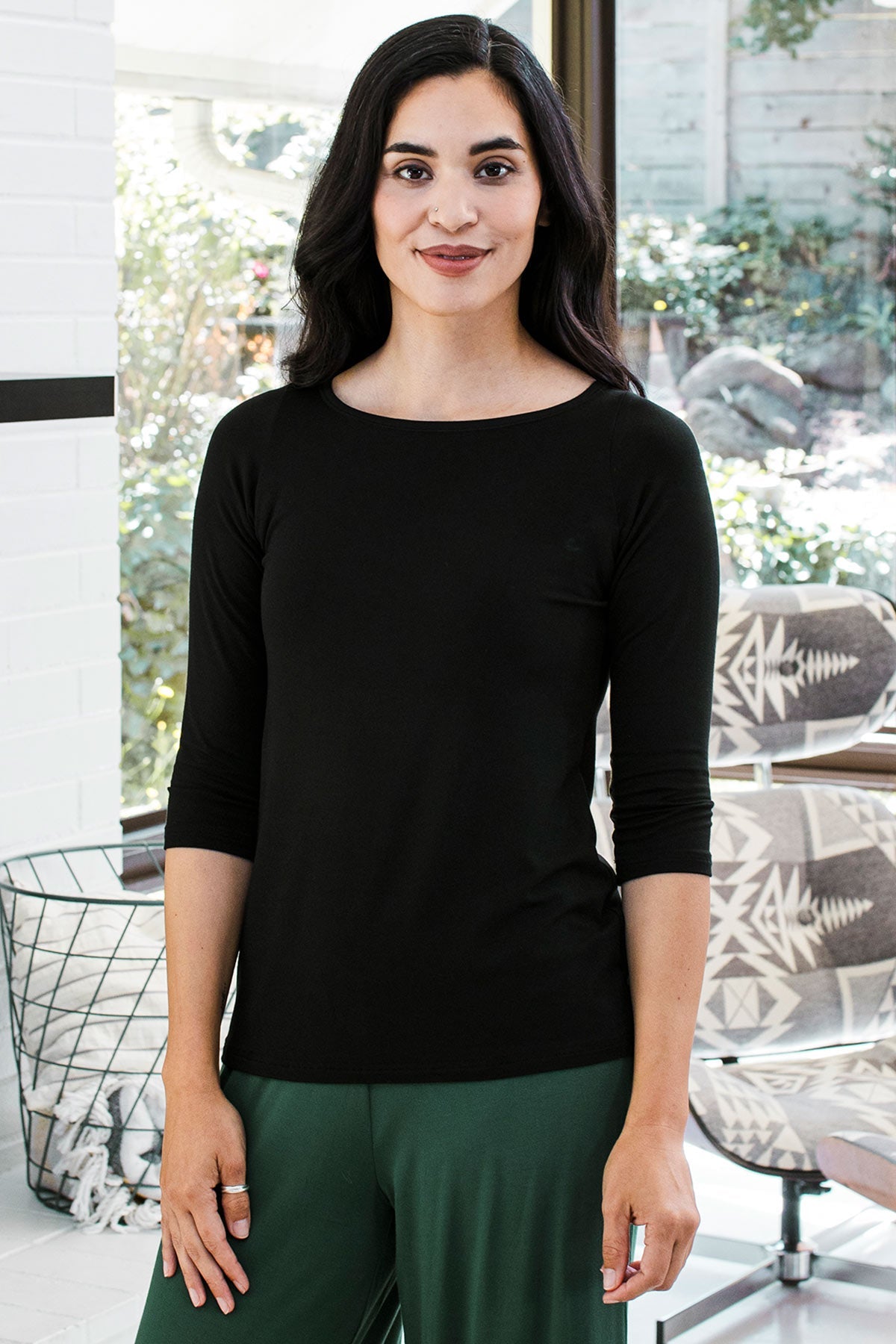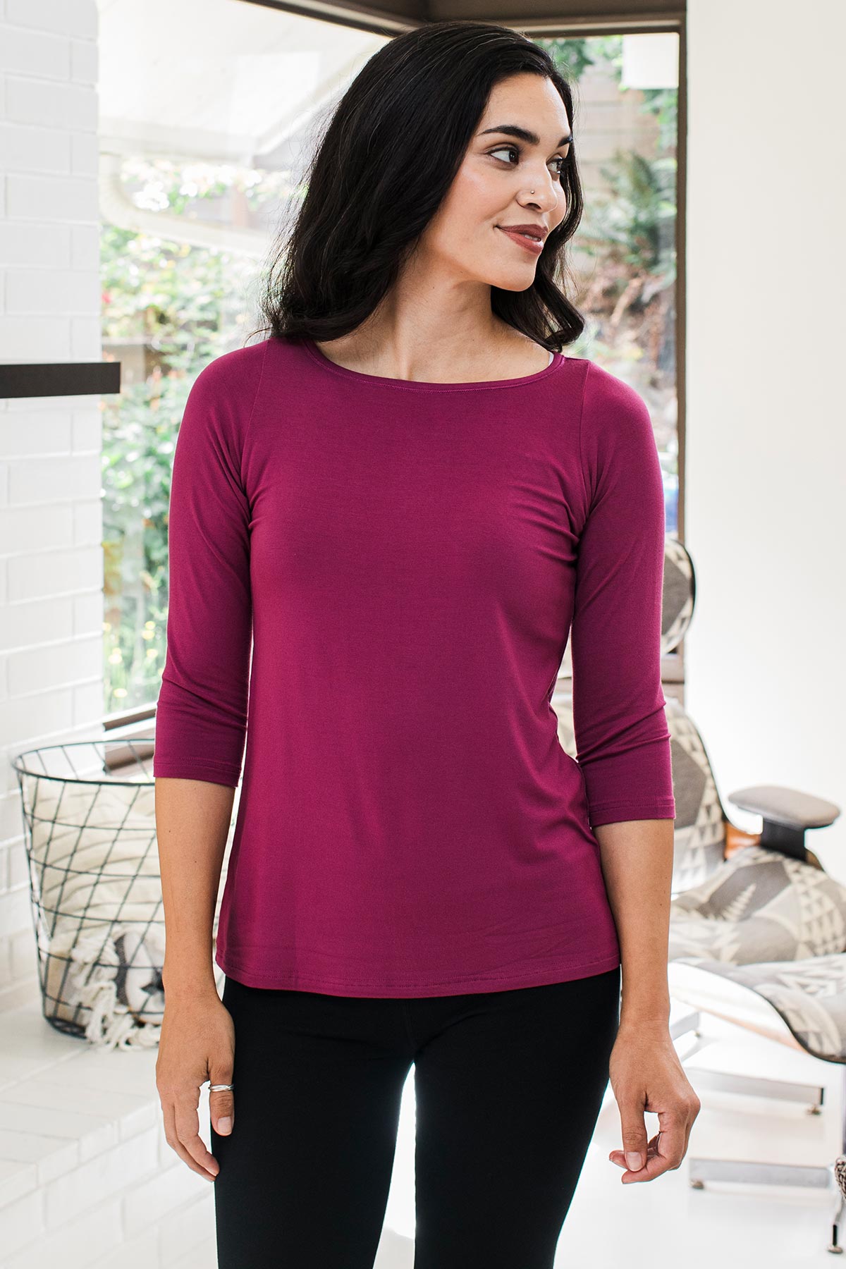 Our customers repeatedly tell us they purchase the Kai Top in multiples for its versatility. It is beloved for travel, leisure, and even pregnancy. Layer it into smart work ensembles for dreamy comfort at the office. Boatneck, three-quarter sleeves. Relaxed fit through the body, hip length.