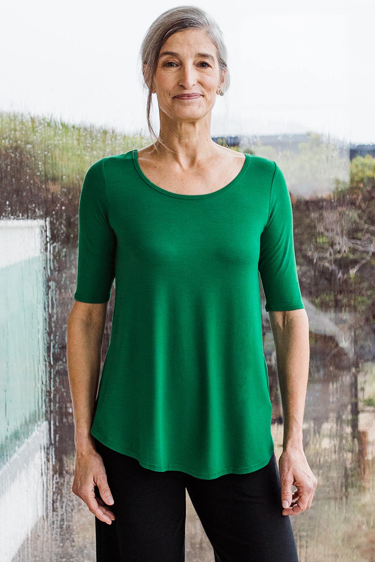 The Sandy Top combines the length of a tunic with the casual comfort of a tee. Perfect for long torsos, there is plenty of length for a smart French tuck or modest tush coverage. However you style it, our feather-soft bamboo fabric won't weigh you down. Features a curved hemline, scoop neck, relaxed fit, and elbow sleeve.