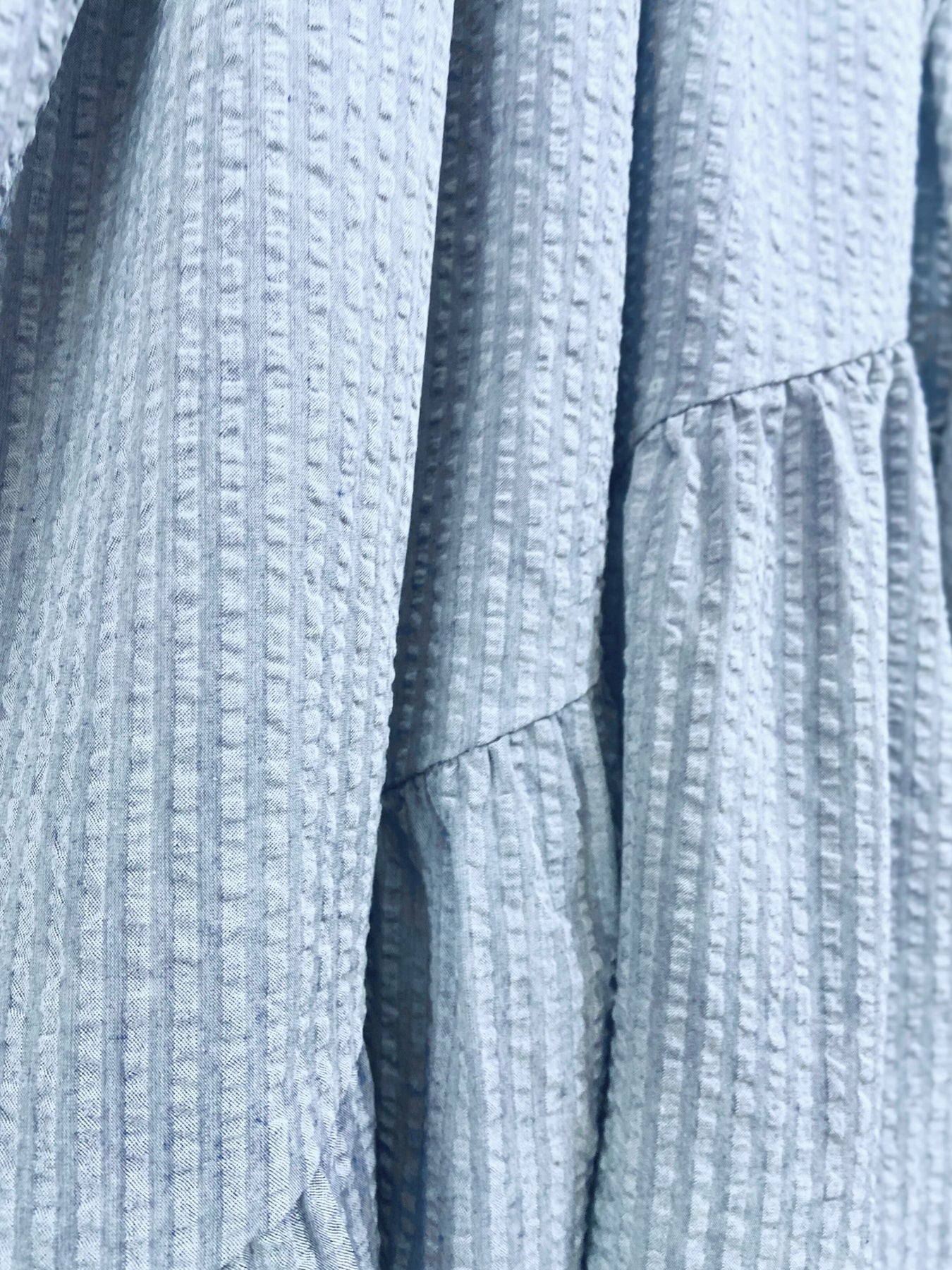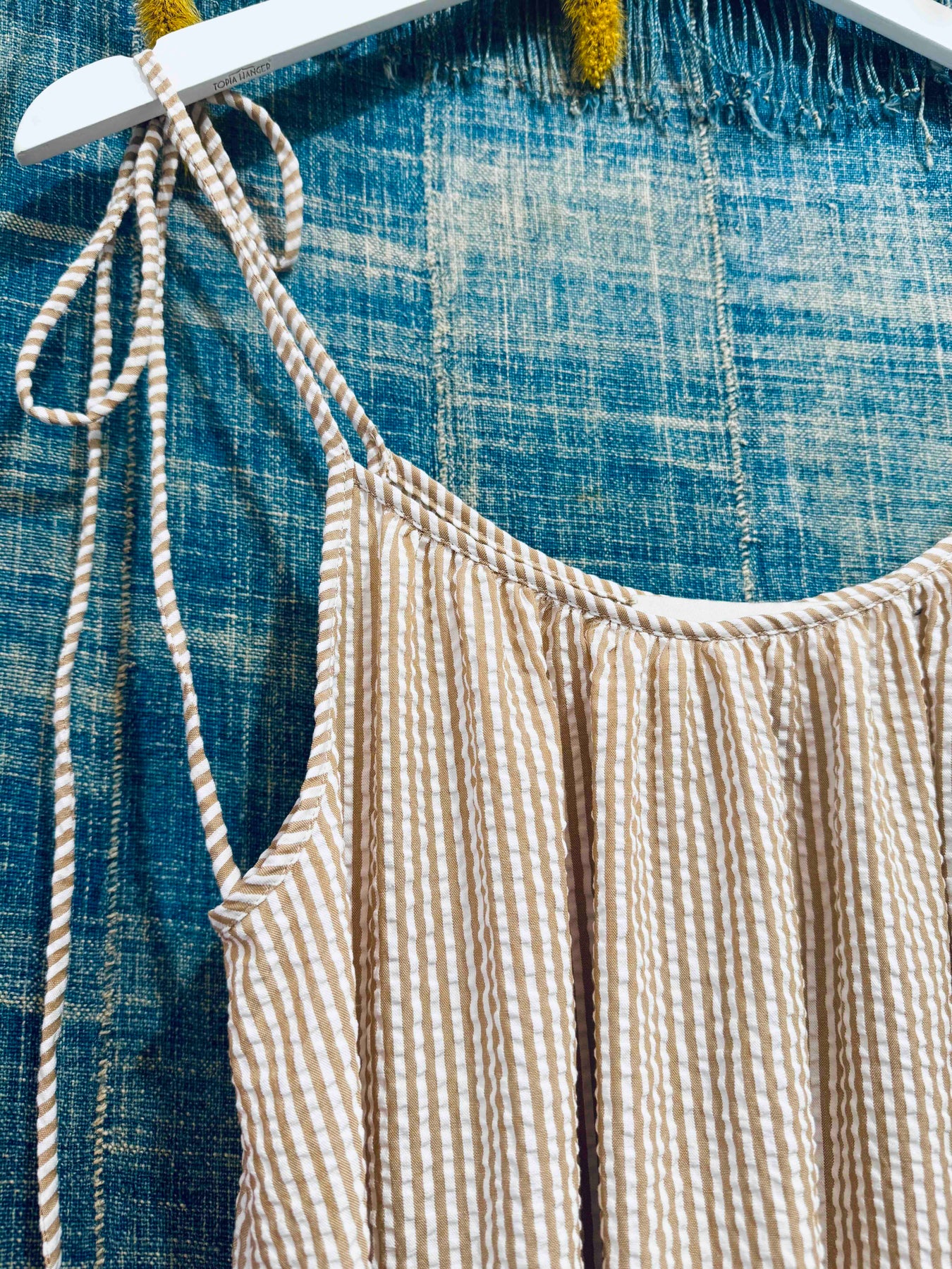 Introducing the Eden sundress in an exquisite cotton seersucker stripe from Holland- minimal, effortless and timeless. Accessorize with our Vizor hat and one of our gorgeous bags.