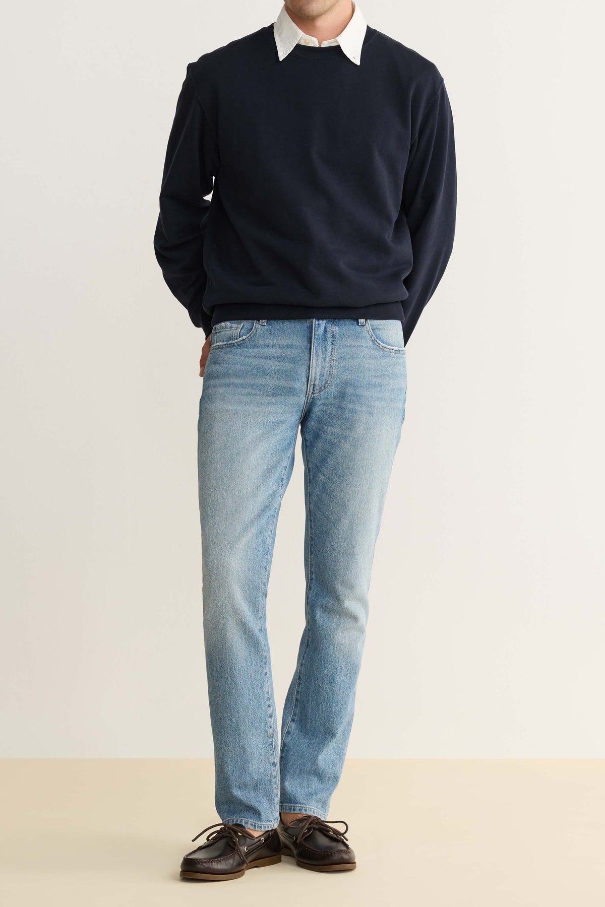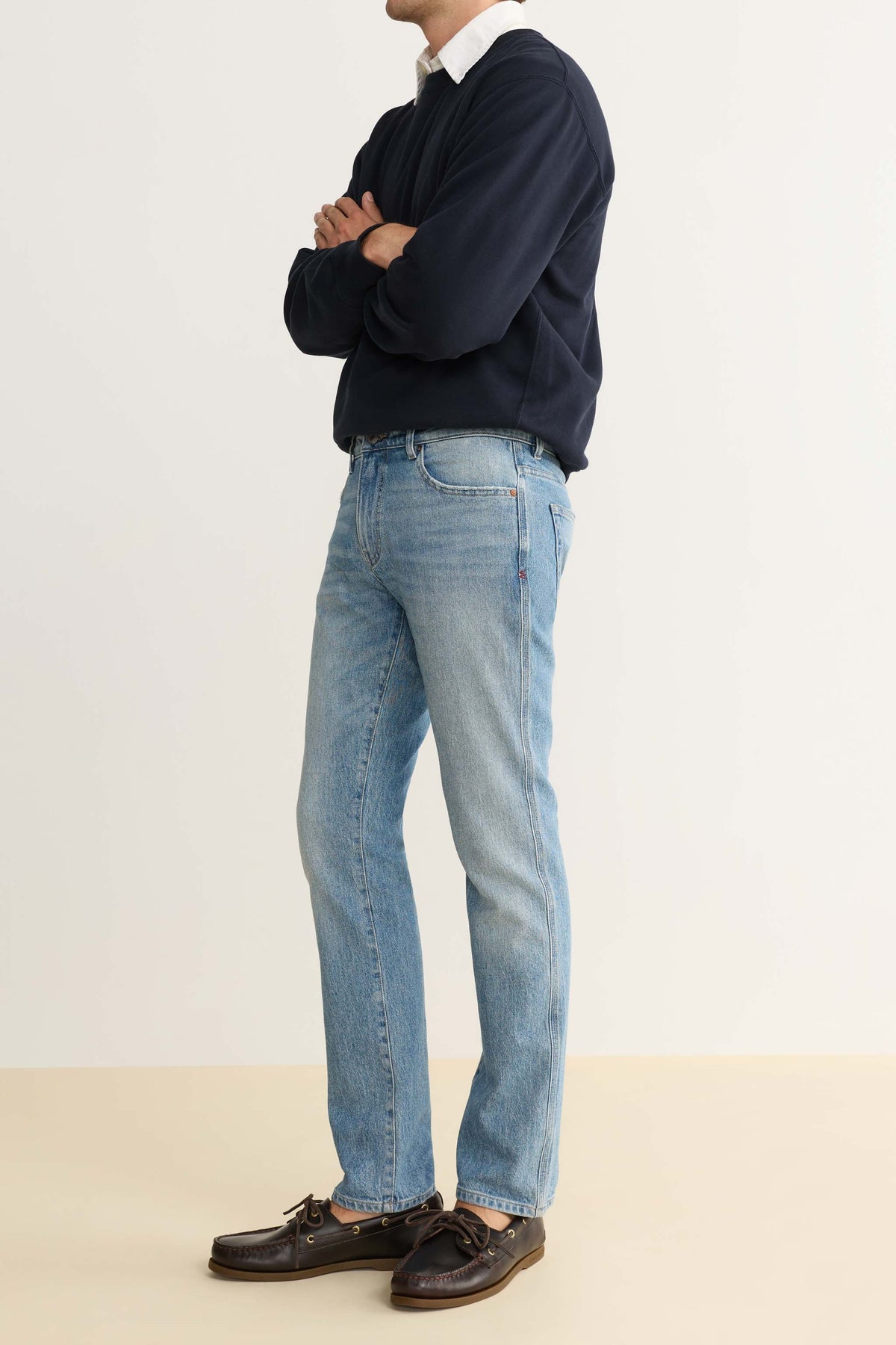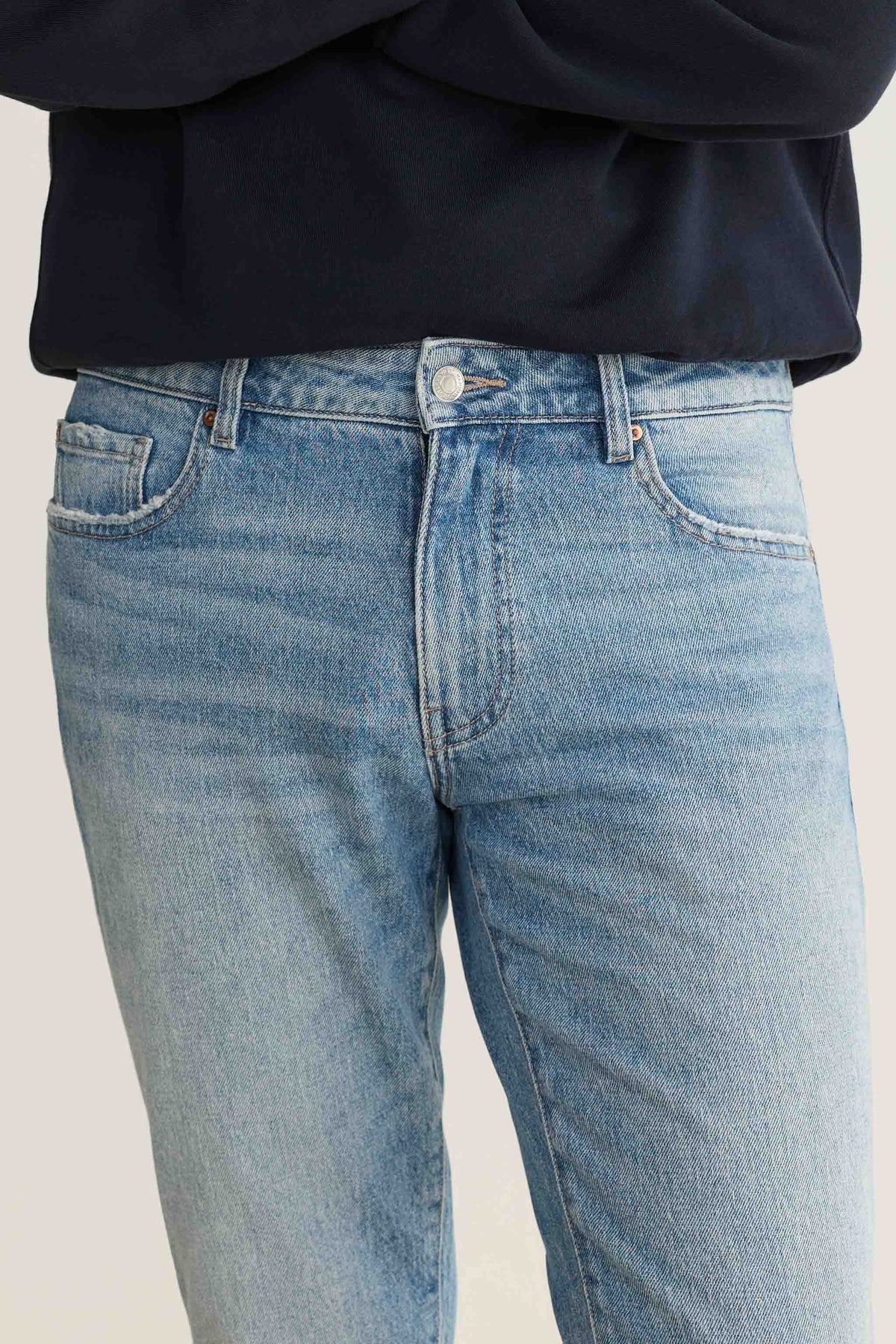 Our most popular slim-fit jeans are sharp but not skinny, a silhouette we first fell for in Amsterdam. Crafted from high-retention stretch fabric that’s engineered to prevent baggy knees and saggy waistbands, it’s a versatile, high-performance denim that’s extremely durable and easy to dress up or down. Spinning is a light indigo wash with subtle character throughout. It features a brushed silver shank, copper rivet and a clean hem.