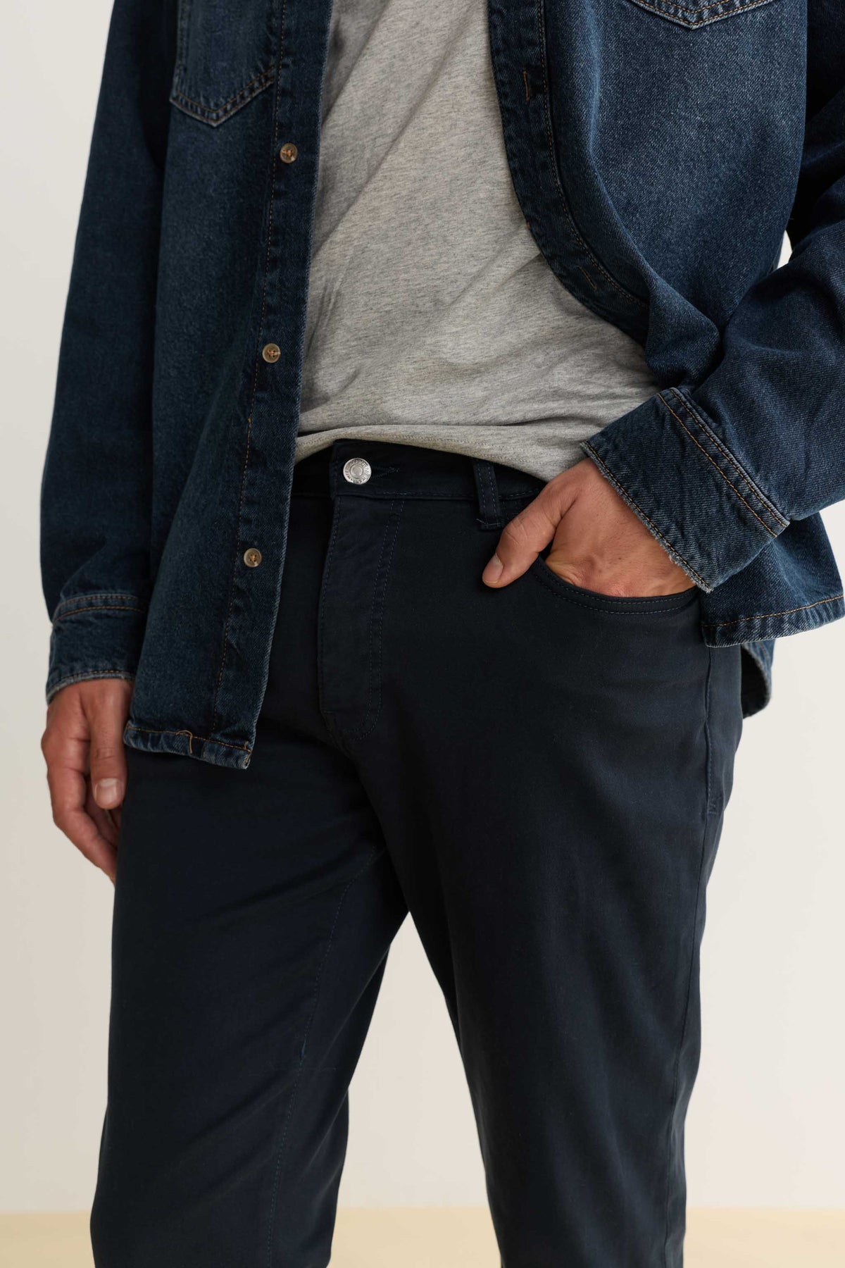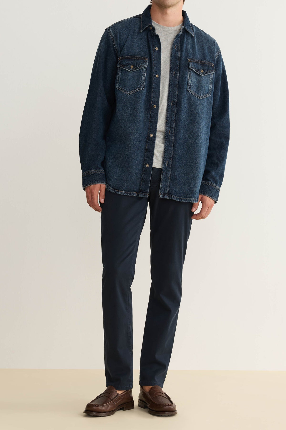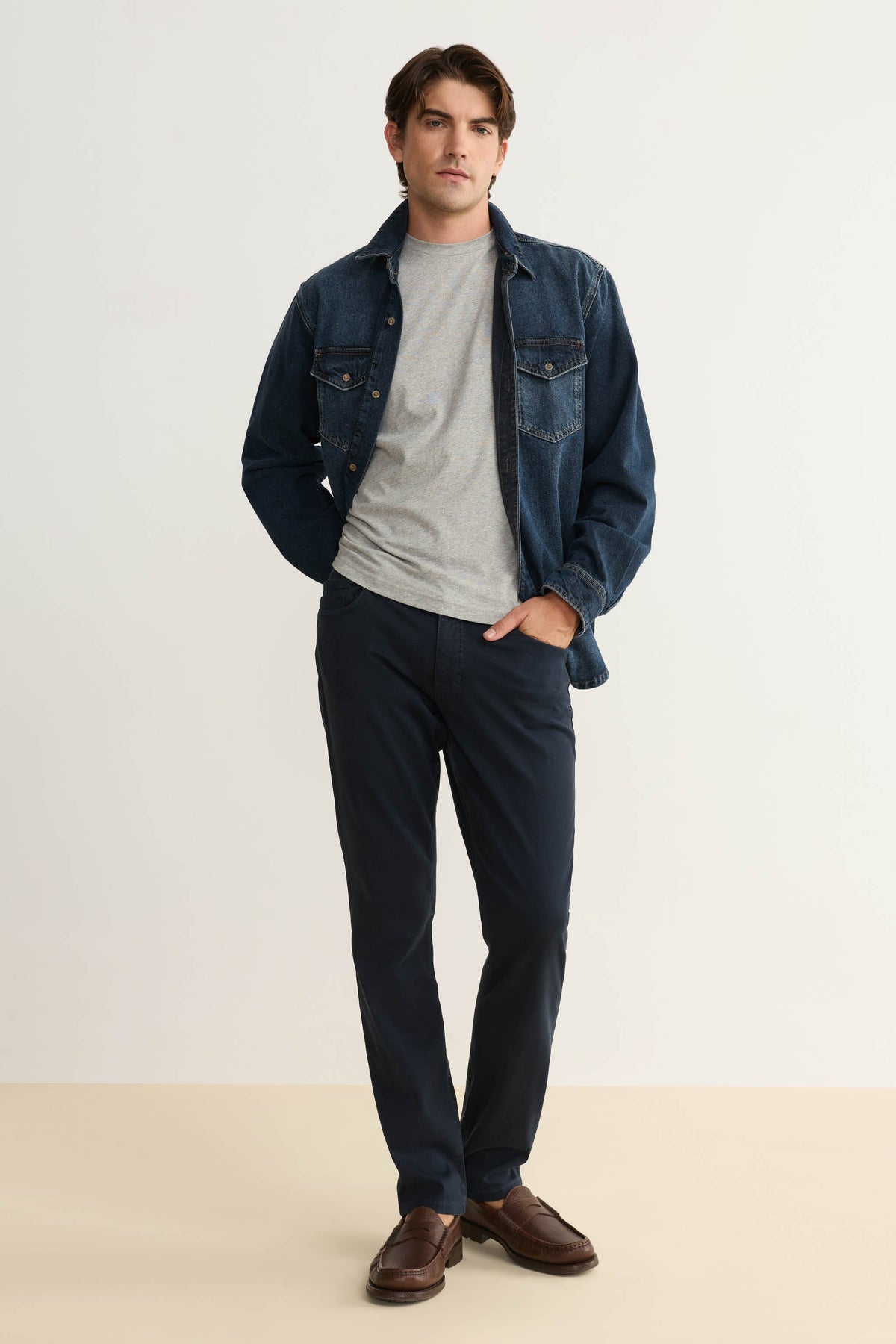 Our most popular slim-fit jeans are sharp but not skinny, a silhouette we first fell for in Amsterdam. Crafted from high-retention stretch fabric that’s engineered to prevent baggy knees and saggy waistbands, it’s a versatile, high-performance denim that’s extremely durable and easy to dress up or down. Carbon Blue is a classic navy hue in our lightweight twill fabric. It features a silver shank and a clean hem.