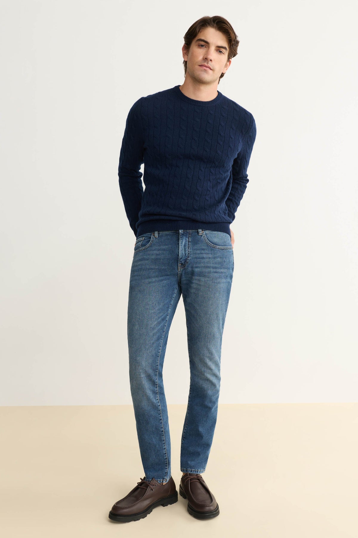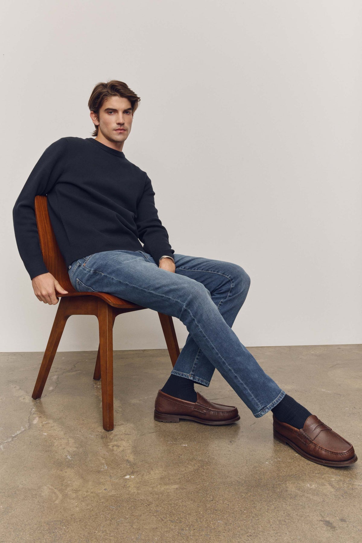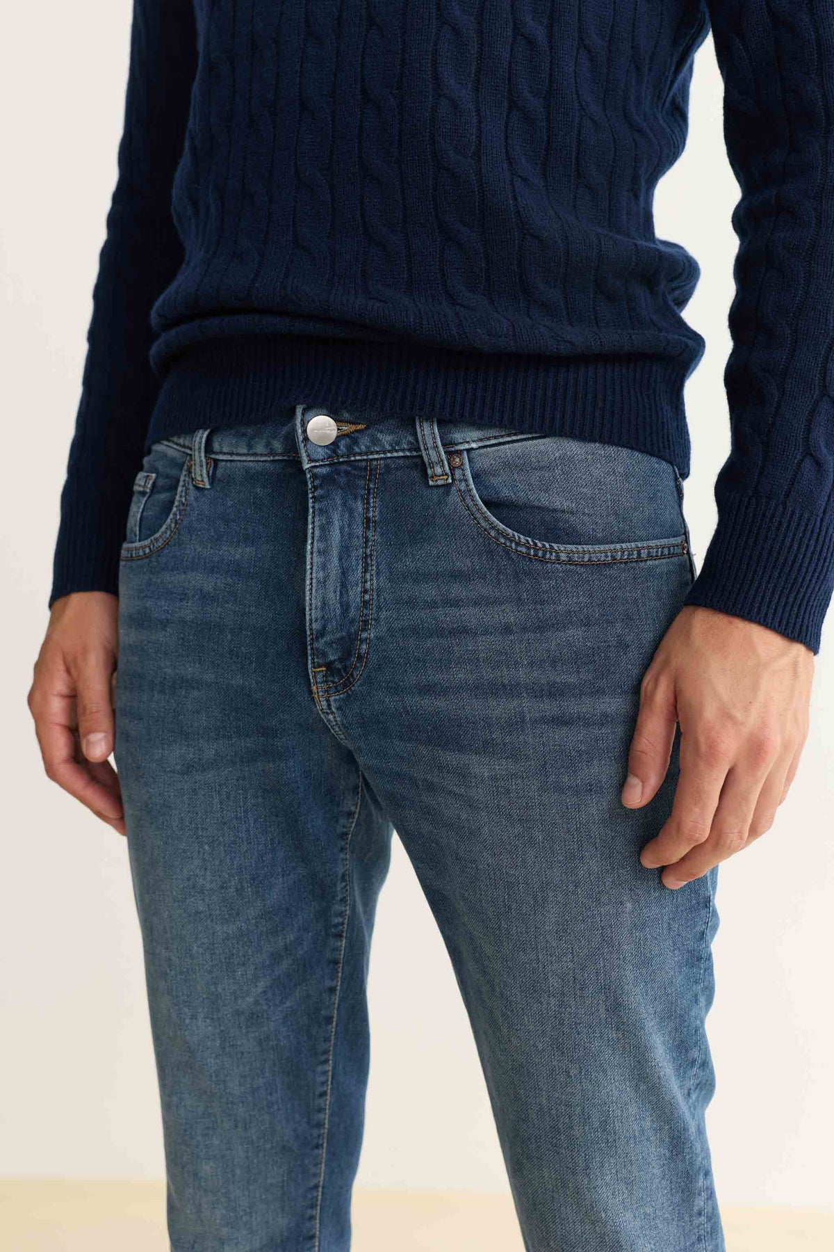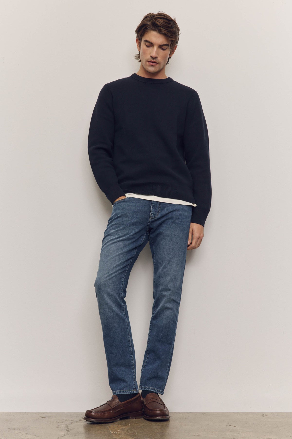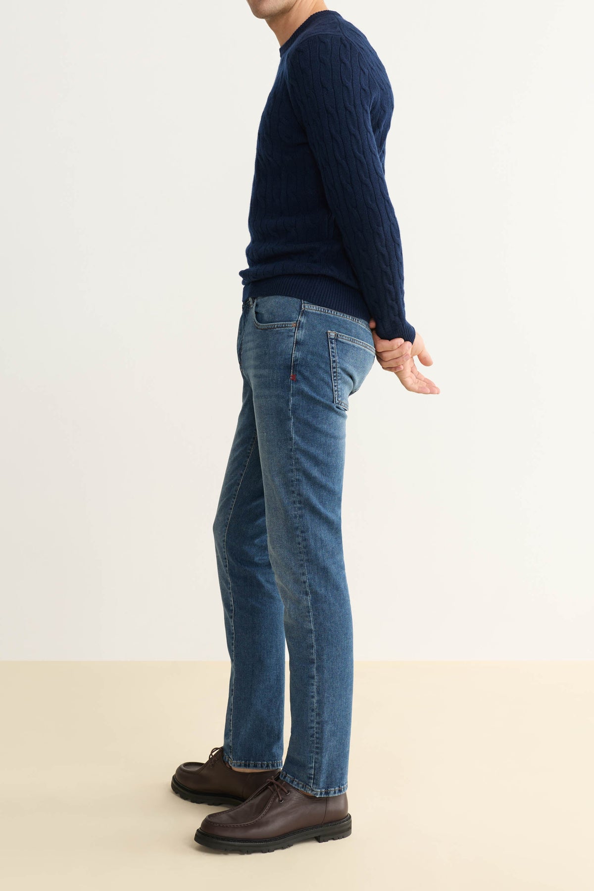 Our most popular slim-fit jeans are sharp but not skinny, a silhouette we first fell for in Amsterdam. Crafted from high-retention stretch fabric that’s engineered to prevent baggy knees and saggy waistbands, it’s a versatile, high-performance denim that’s extremely durable and easy to dress up or down. Oxford is a mid-to-dark indigo wash with a silver shank, copper rivets and a clean hem.